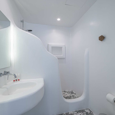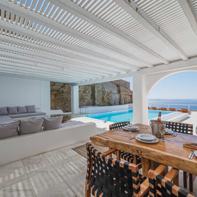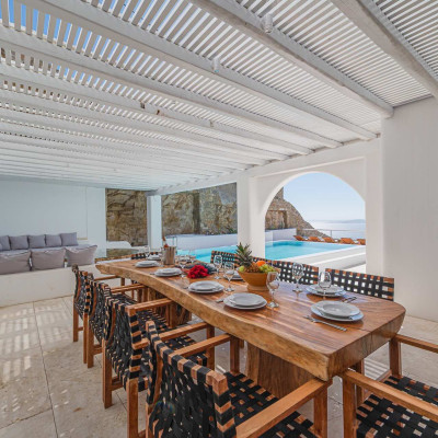 The 50 sq. meter infinity pool, offering breathtaking sunset views of the Aegean Sea, is the centerpiece of the villa's grounds. Complementing the pool is a spacious dining area with seating for 12, along with multiple shaded lounge spaces beneath beautiful pergolas. These areas are perfect for relaxation during the day or hosting romantic dinners and cocktail events in the evening. Surrounded by natural rocky landscapes, the villa's outdoor design creates a serene and luxurious environment, blending seamlessly with nature to deliver a unique experience.