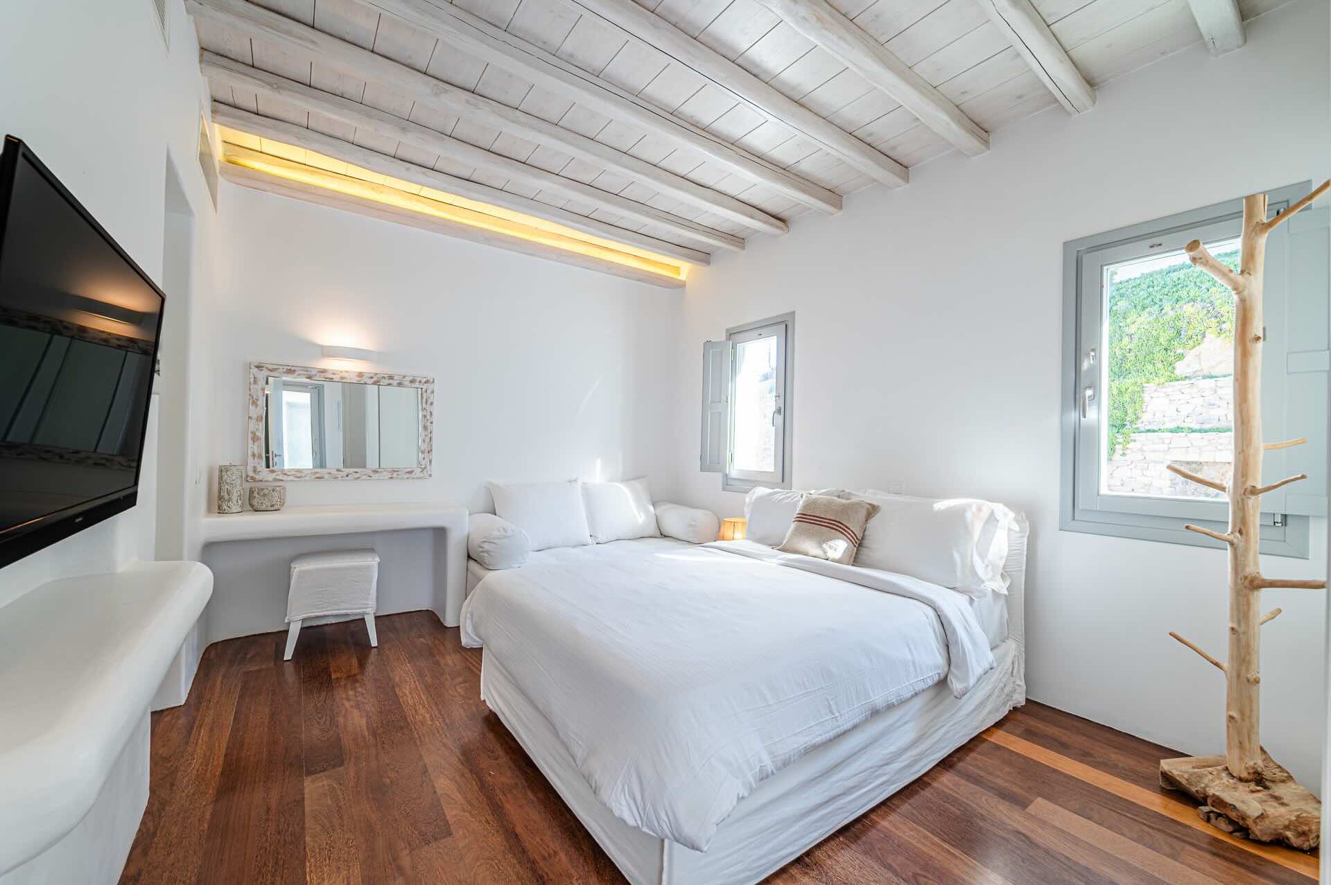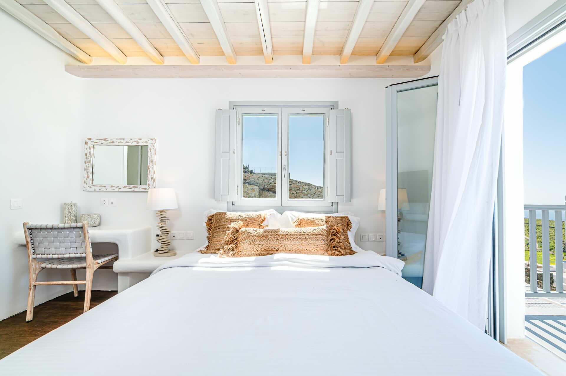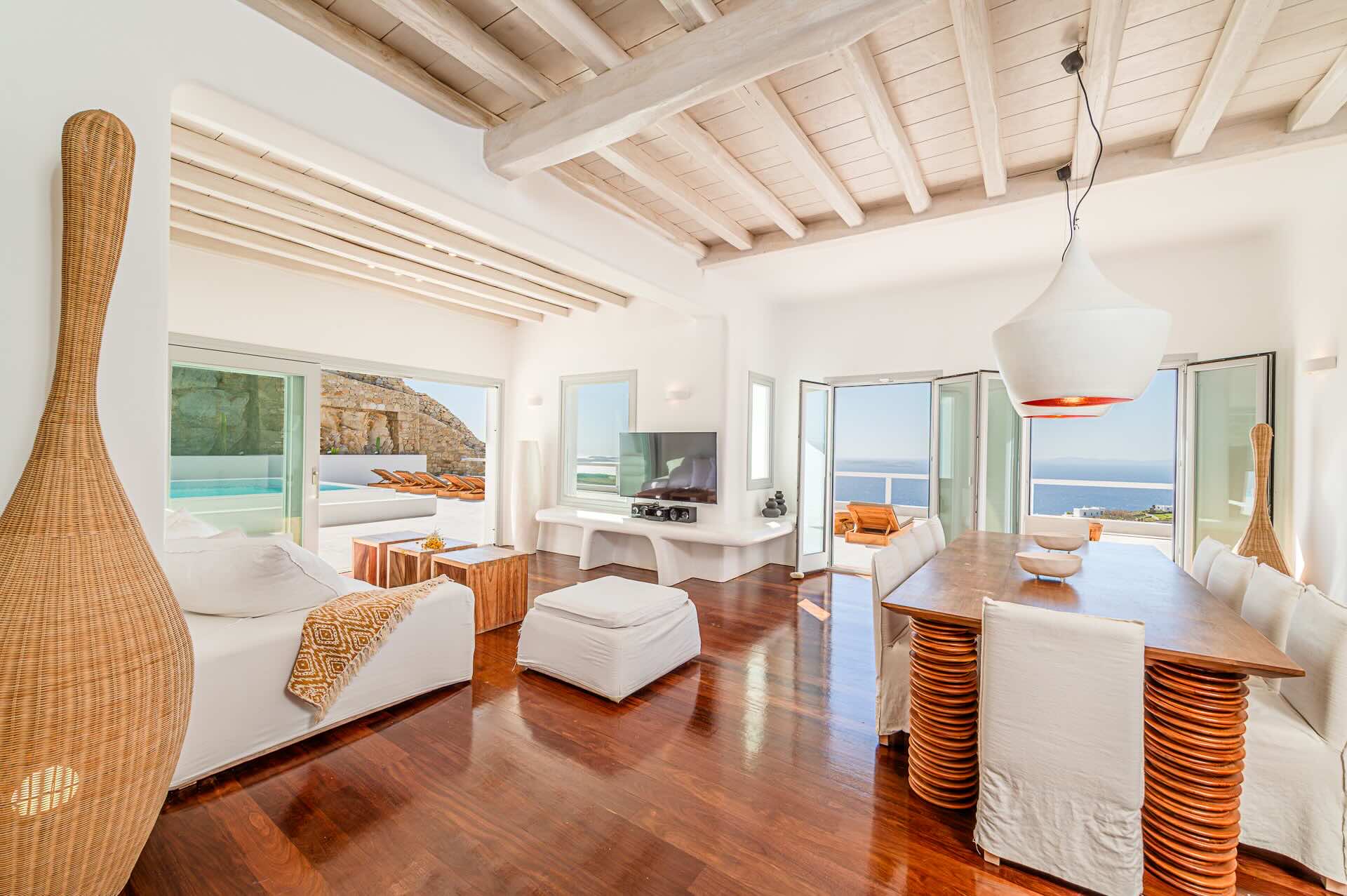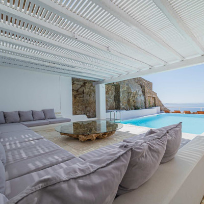 The Cycladic Mykonian architecture of this beautiful villa, in combination with the modern furniture, creates an elegant result as well as an impressive atmosphere.