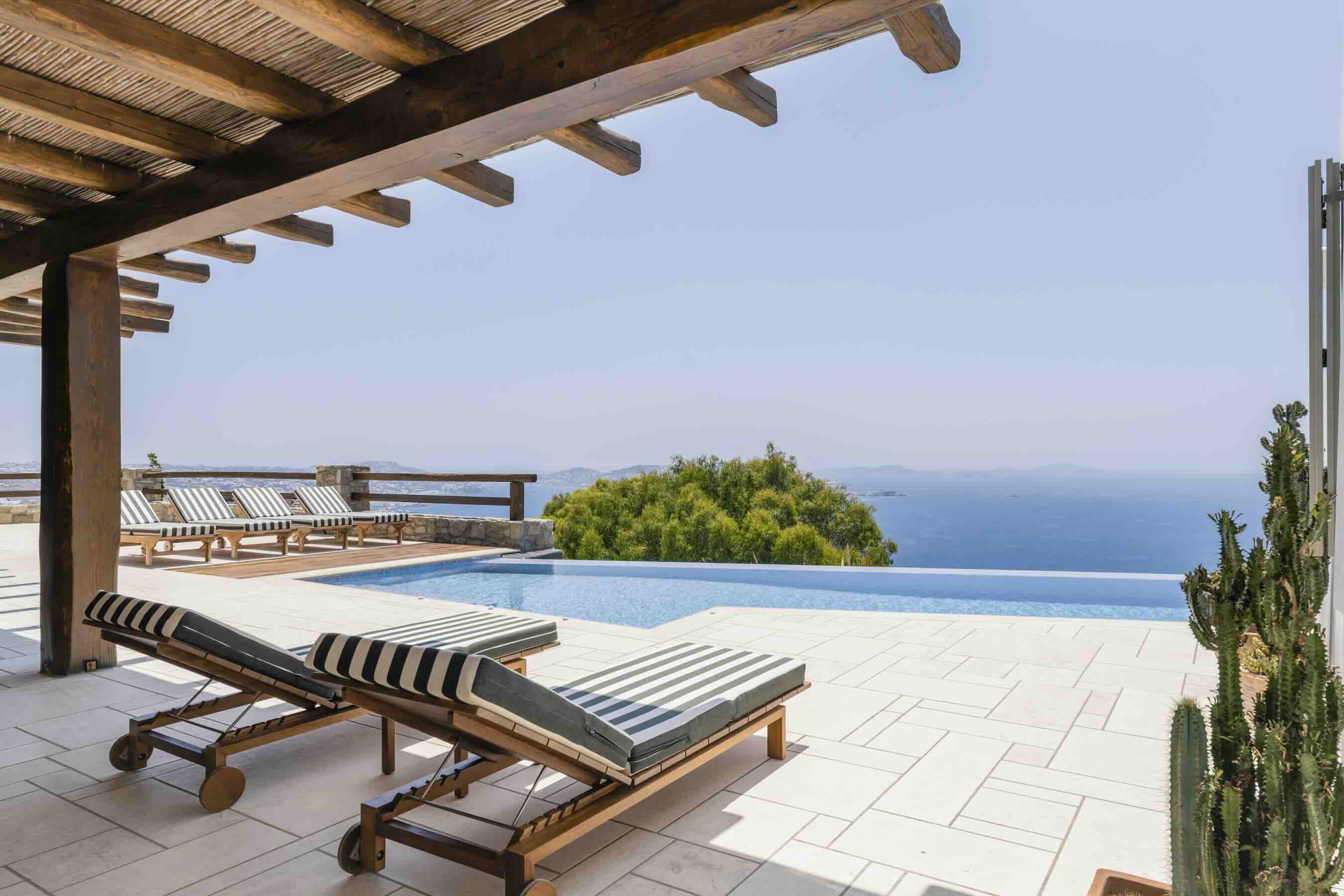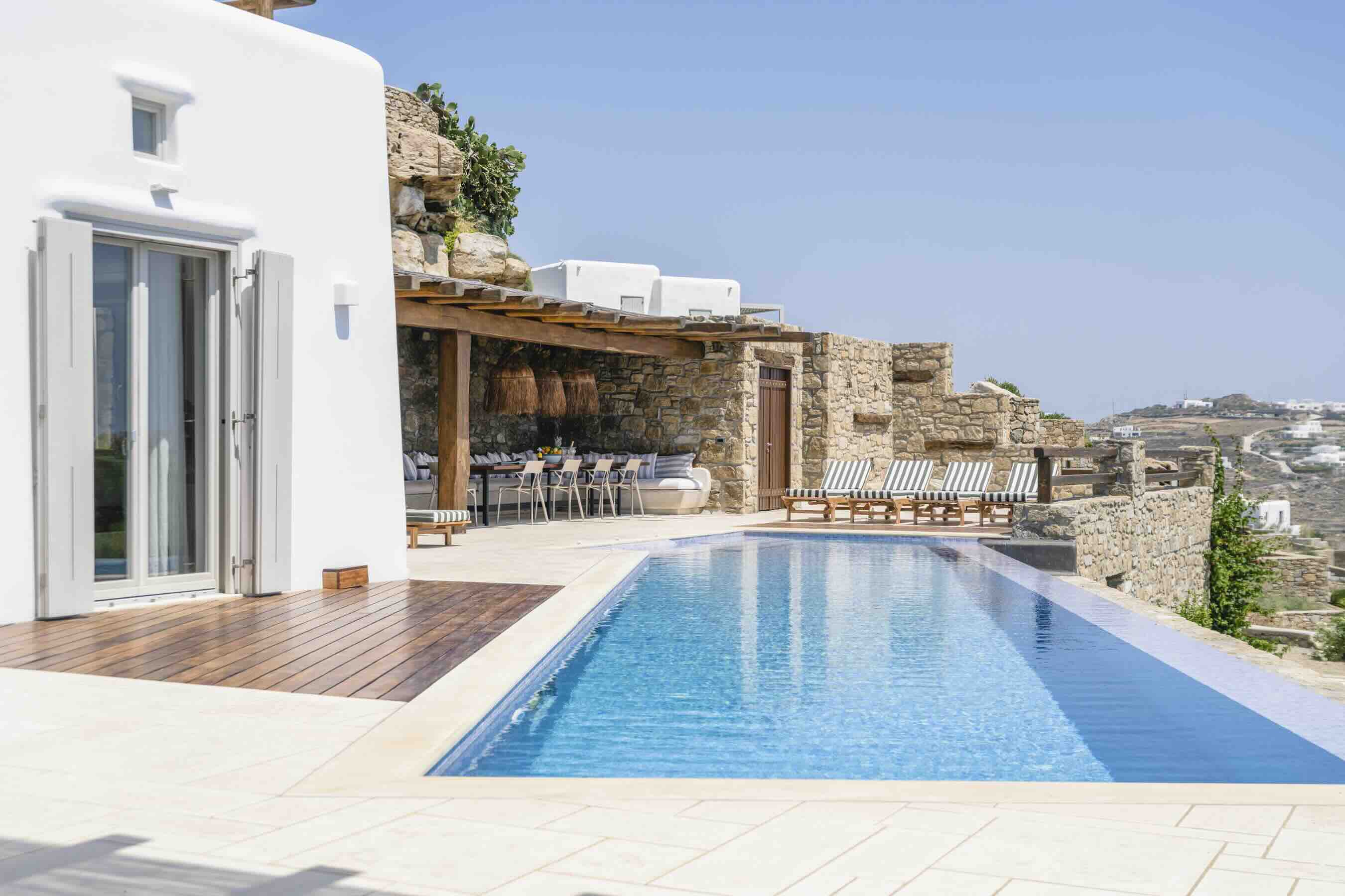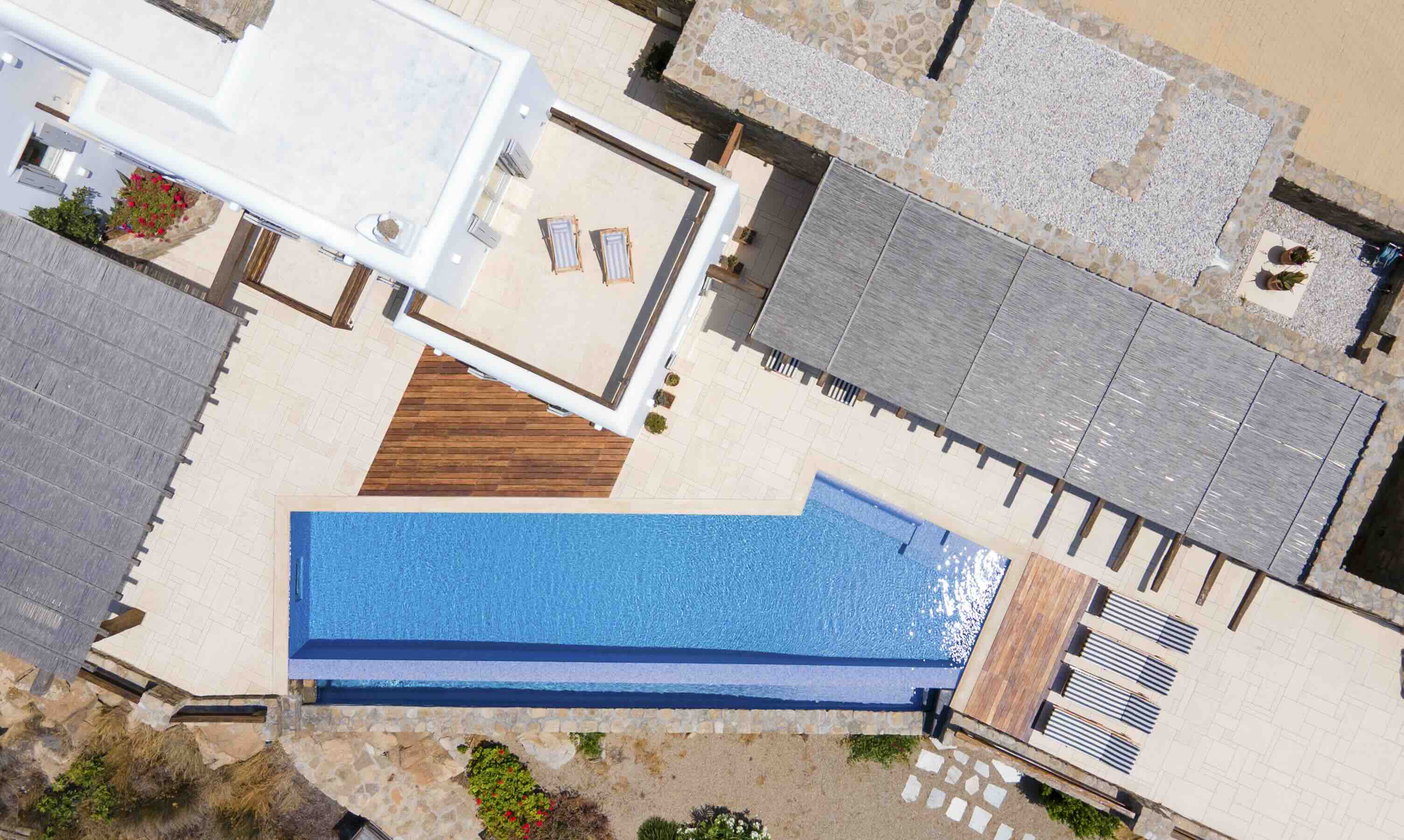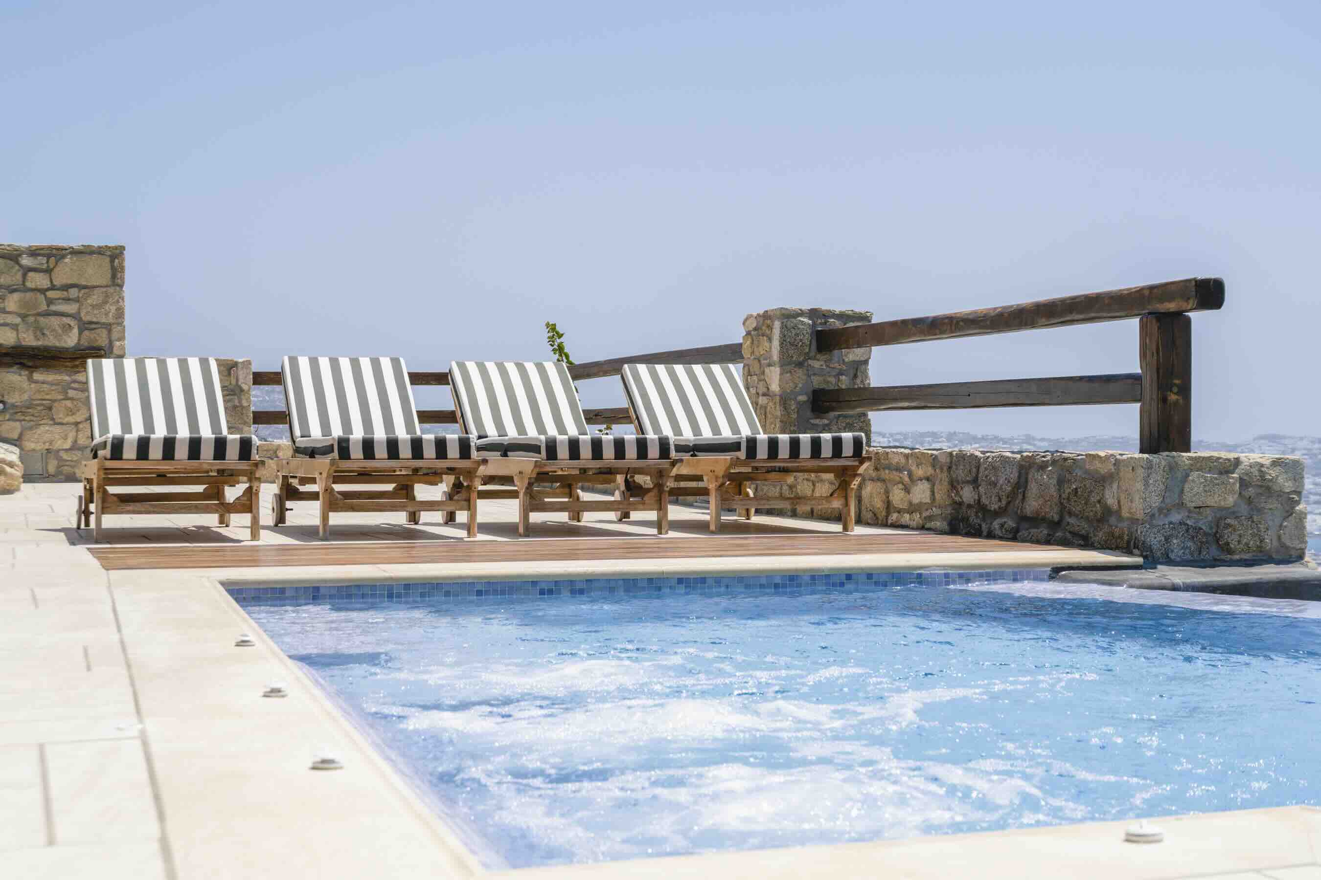 The outdoor common areas consist mainly of the private swimming pool, a spacious, relaxing, and romantic environment, designed to contribute to your rejuvenation during your vacation on Mykonos Island. Swim in the comfortable swimming pool of the villa and enjoy the Mediterranean sun in one of the cozy sun lounges around the pool.