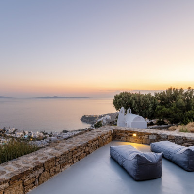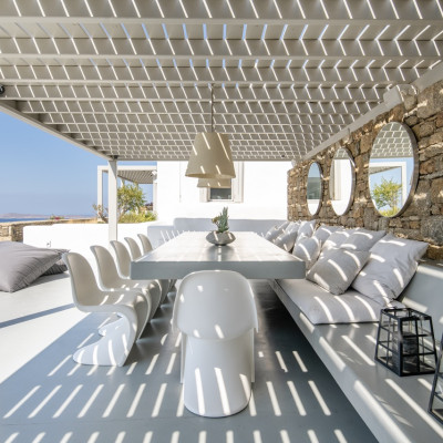 Set in the prestigious area of Tourlos, this sophisticated luxury villa offers panoramic views over Mykonos Town and the Aegean Sea, combining contemporary architecture with refined comfort and absolute privacy. Designed for discerning guests, the property delivers a seamless balance between elegant indoor living and expansive outdoor spaces, ideal for unforgettable Mykonos stays.