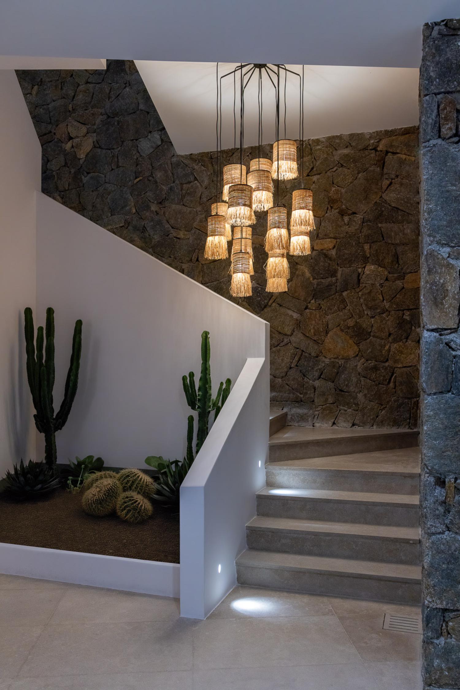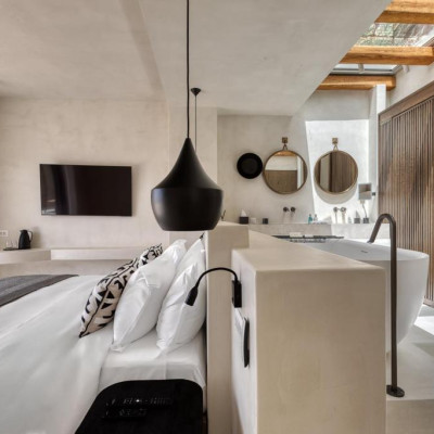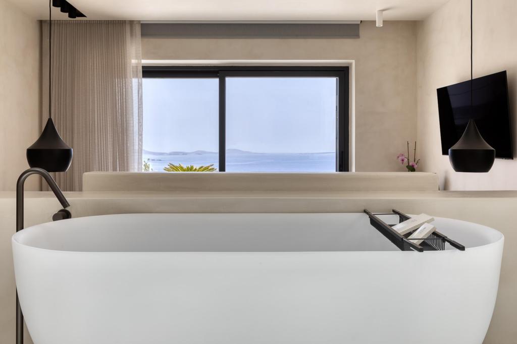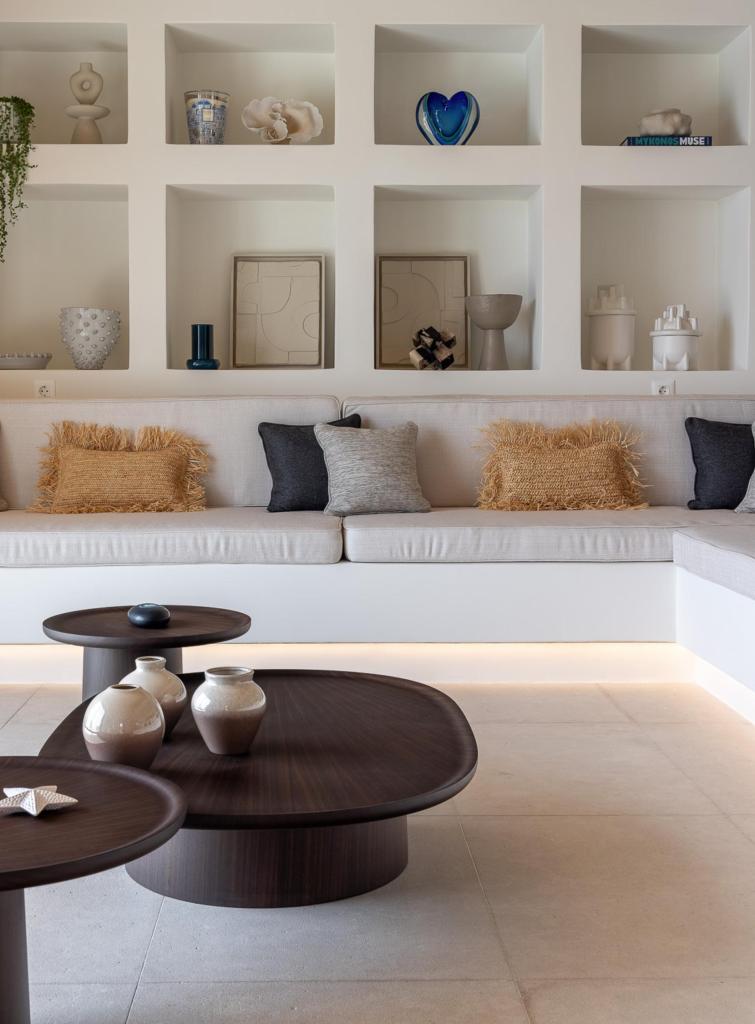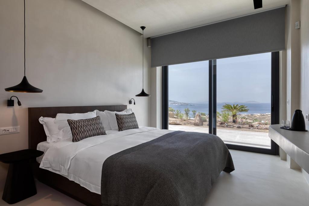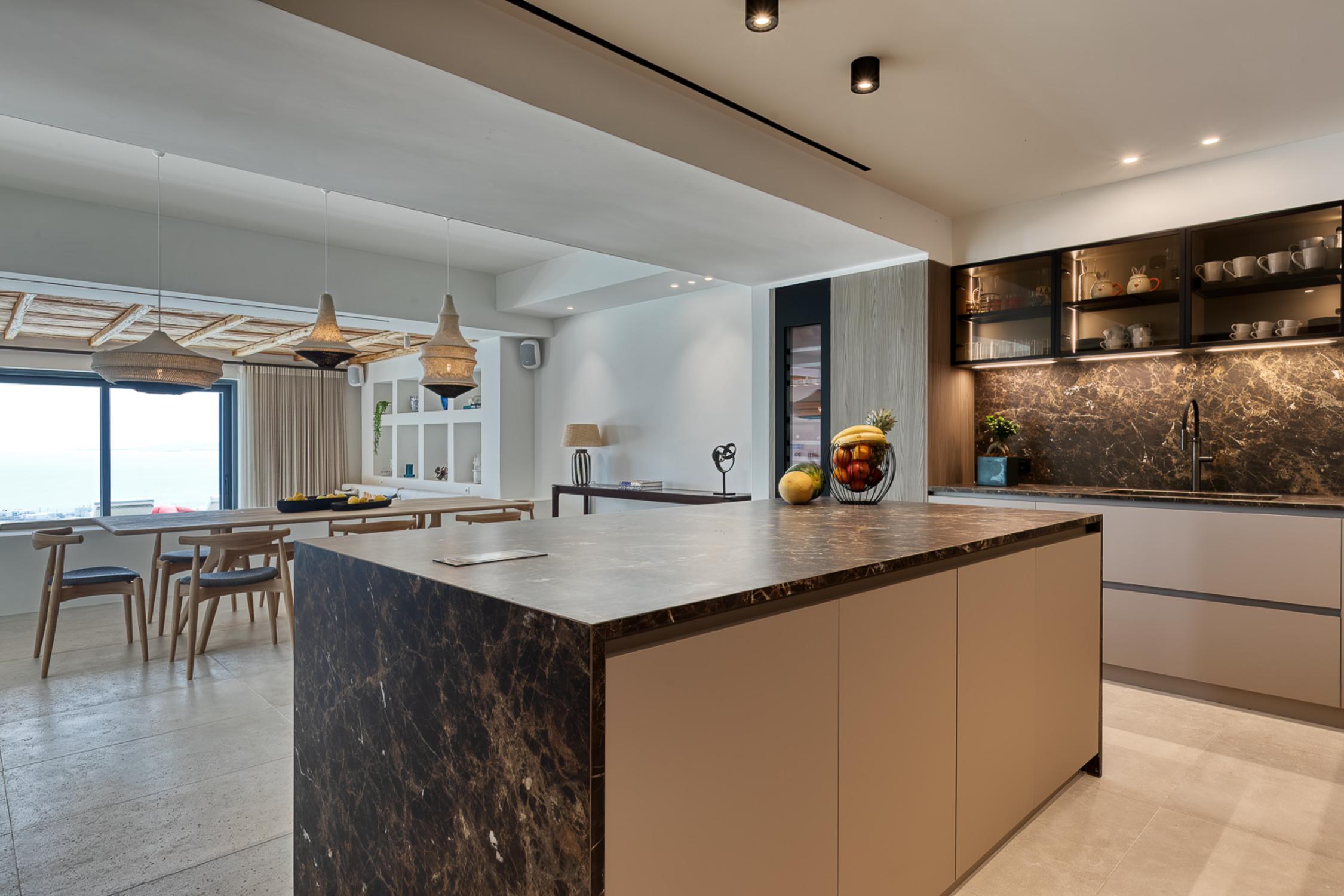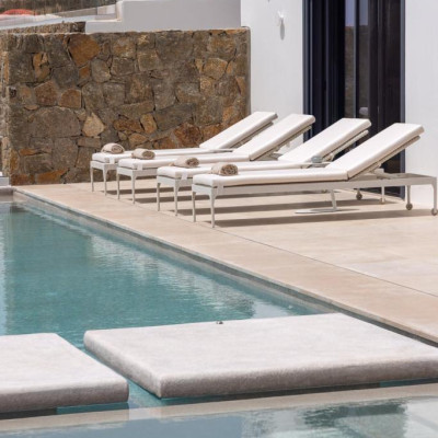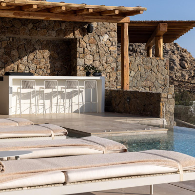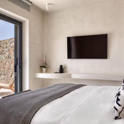 The villa’s outdoor areas are a sanctuary of serenity and luxury. Centered around a heated infinity pool, the expansive terrace features stylish sun loungers, a shaded alfresco dining area, and cozy lounge spots, perfect for entertaining or quiet reflection. Panoramic views of the Aegean Sea and magical sunsets set the stage for unforgettable moments.