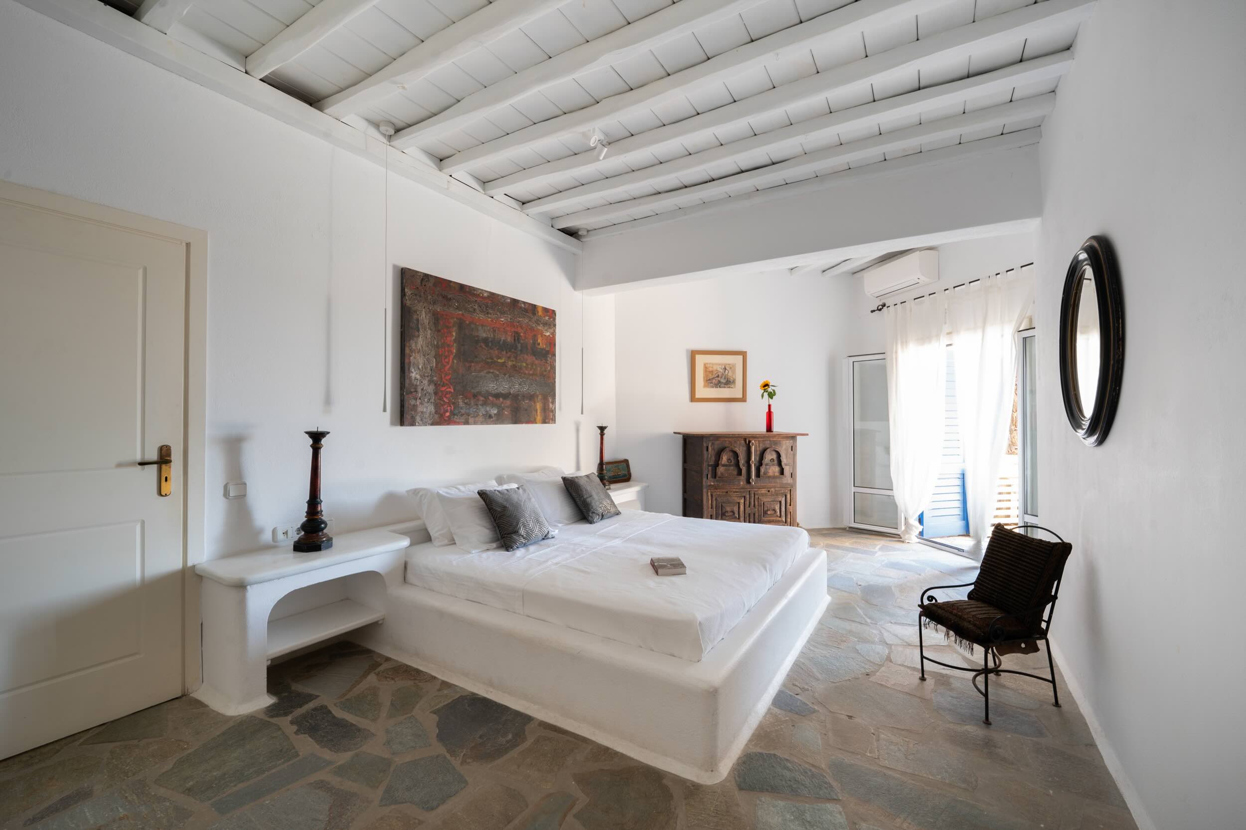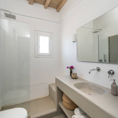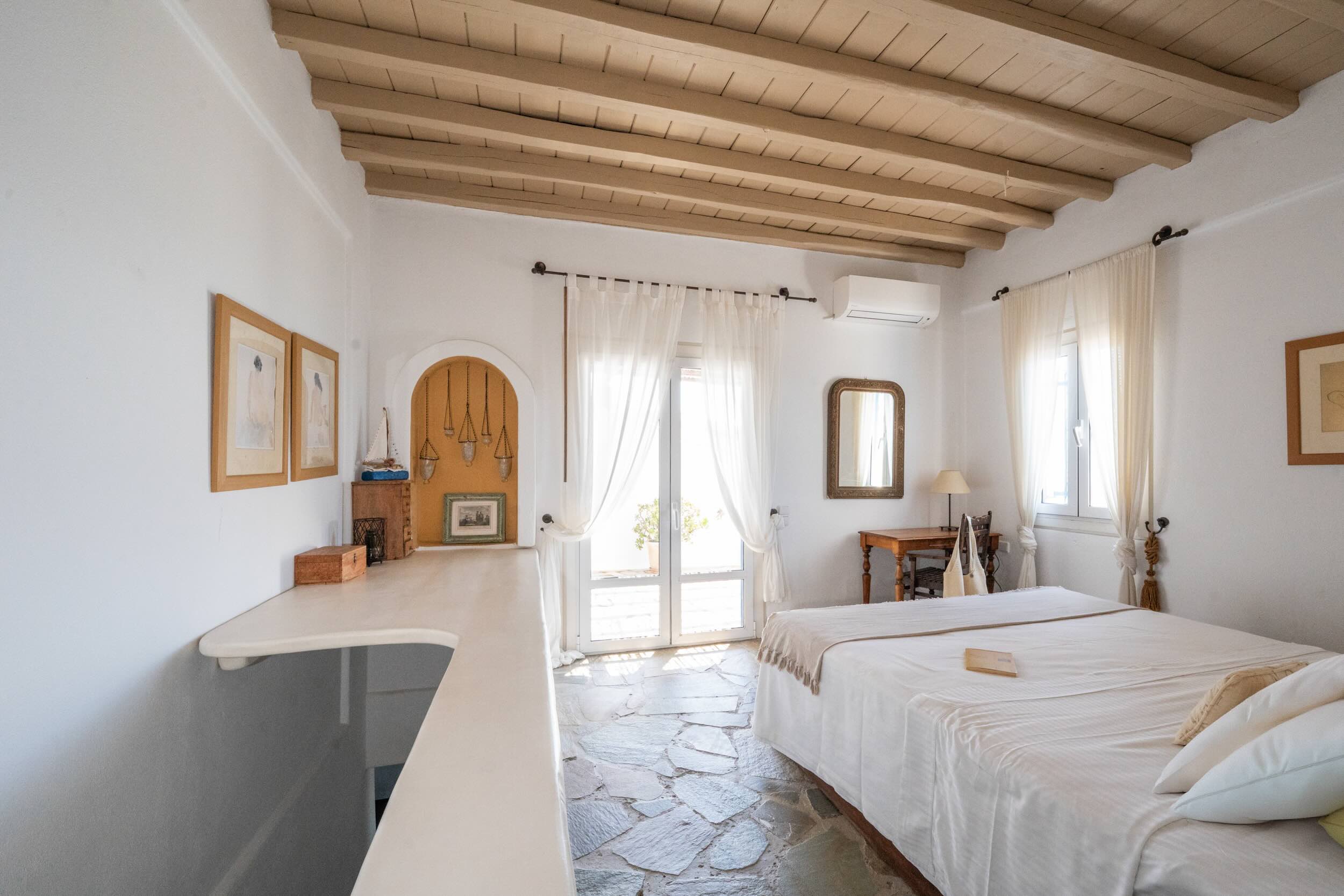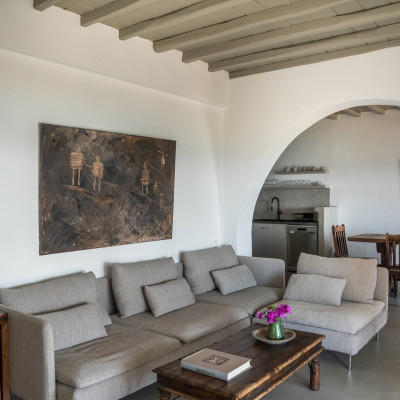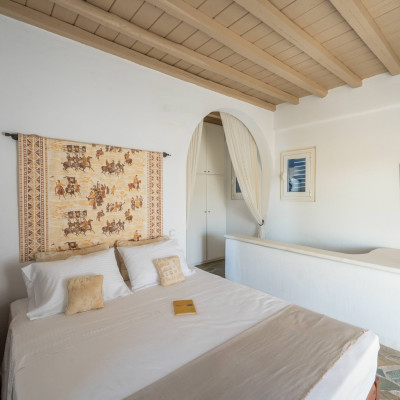 Designed with classic whitewashed architecture and soft, curved lines, the villa blends timeless Cycladic charm with contemporary comfort. It features four spacious bedrooms, each offering privacy, comfort, and beautiful sea views — ideal for families or groups of friends seeking a relaxed yet sophisticated stay.
