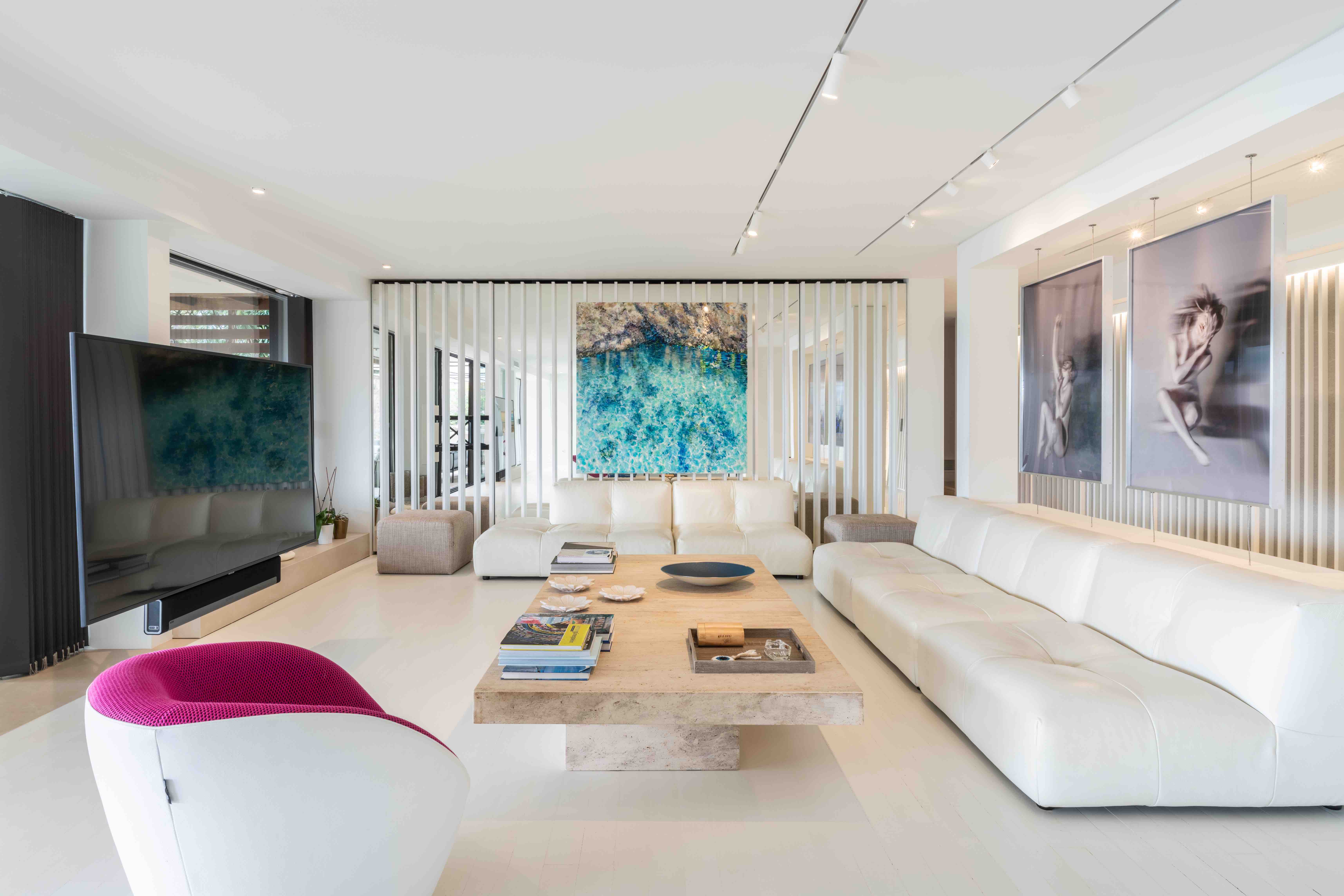 The villa’s interiors are a blend of postmodern sophistication and playful 70s and pop art-inspired design. High-end materials such as stone, wood, and metal are combined with vibrant décor to create a visually captivating environment that encourages both relaxation and creative expression.