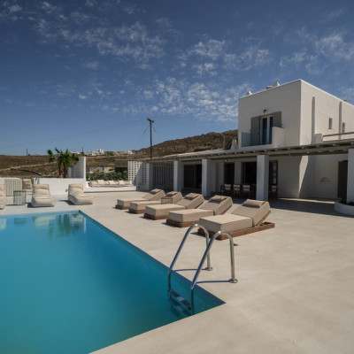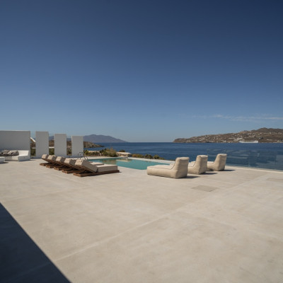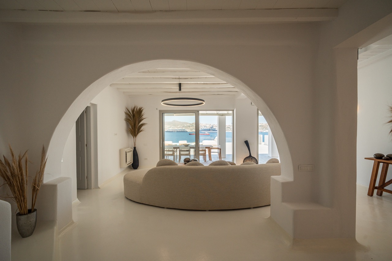Villa Arcade is a refined sea-view villa in Mykonos, located on a hillside in Kanalia with uninterrupted panoramic views over Delos Island, the Aegean Sea, and Mykonos Town.