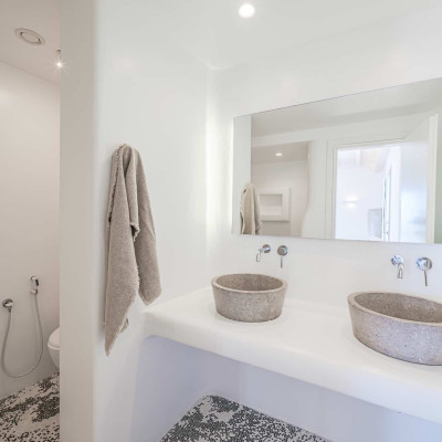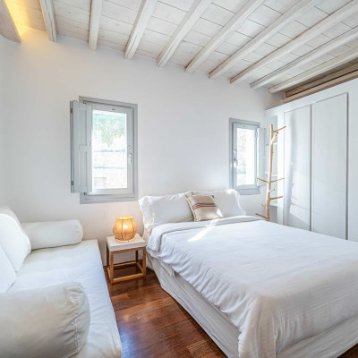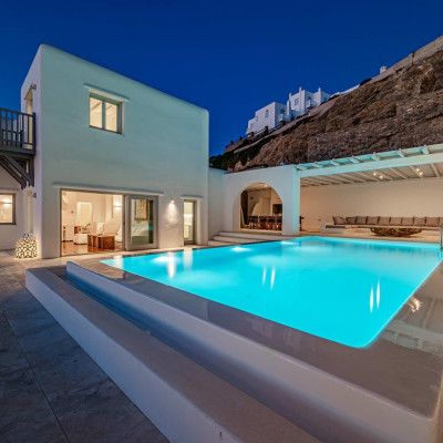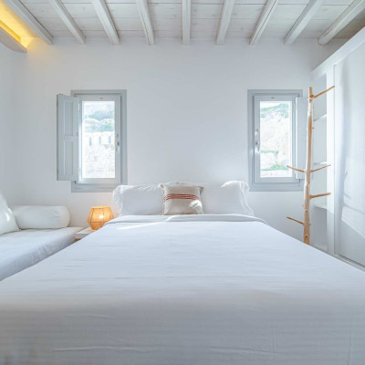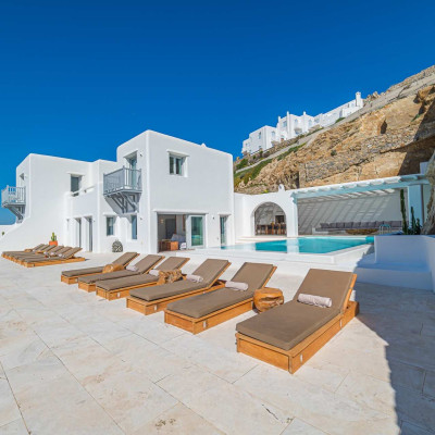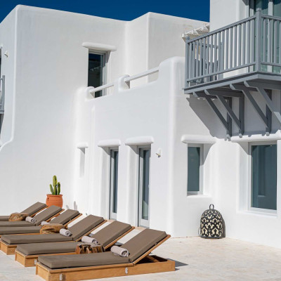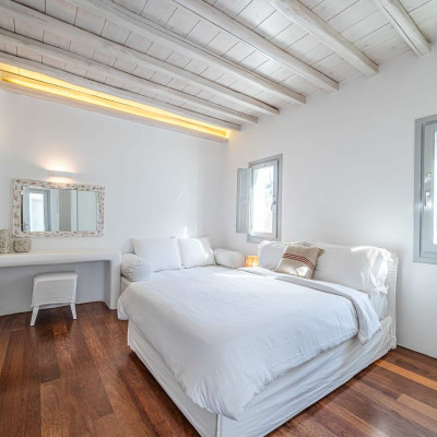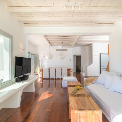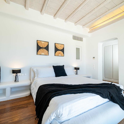 The luxurious 220 sq. meter, 5-bedroom villa is a stunning property meticulously designed to offer a fairy-tale holiday experience. Nestled in the scenic Kastro area, near the new port of Mykonos and overlooking the Aegean sea all the way to Tinos island this villa combines elegance with an idyllic location, promising an unforgettable stay.