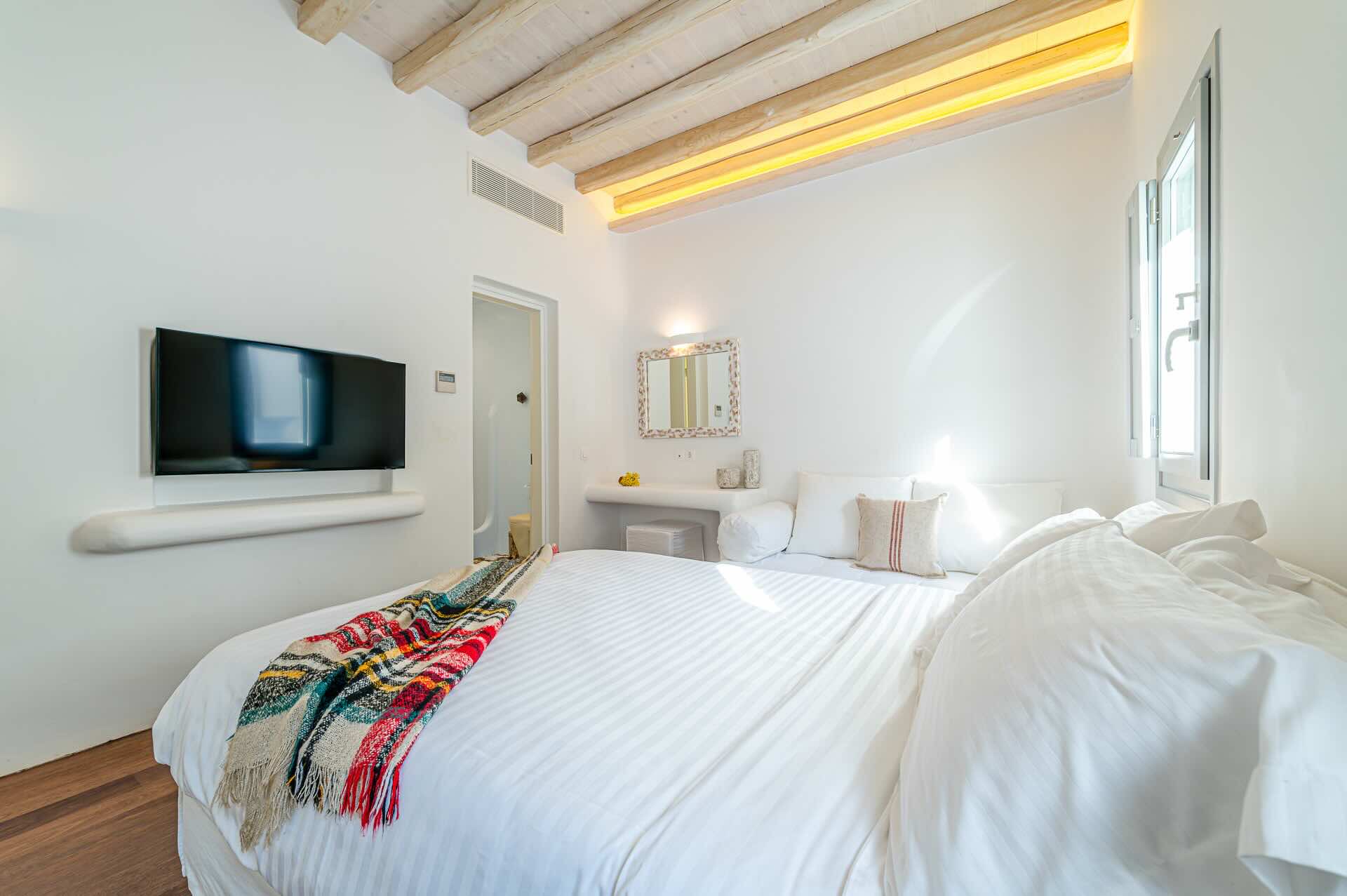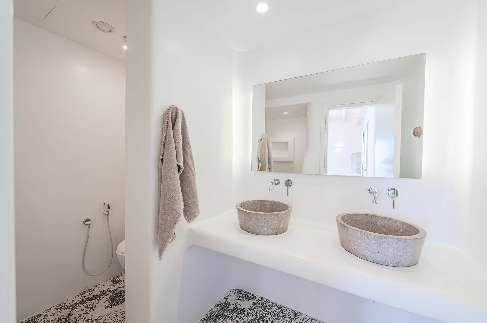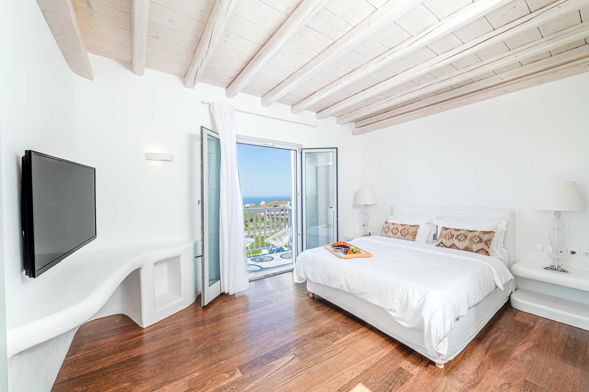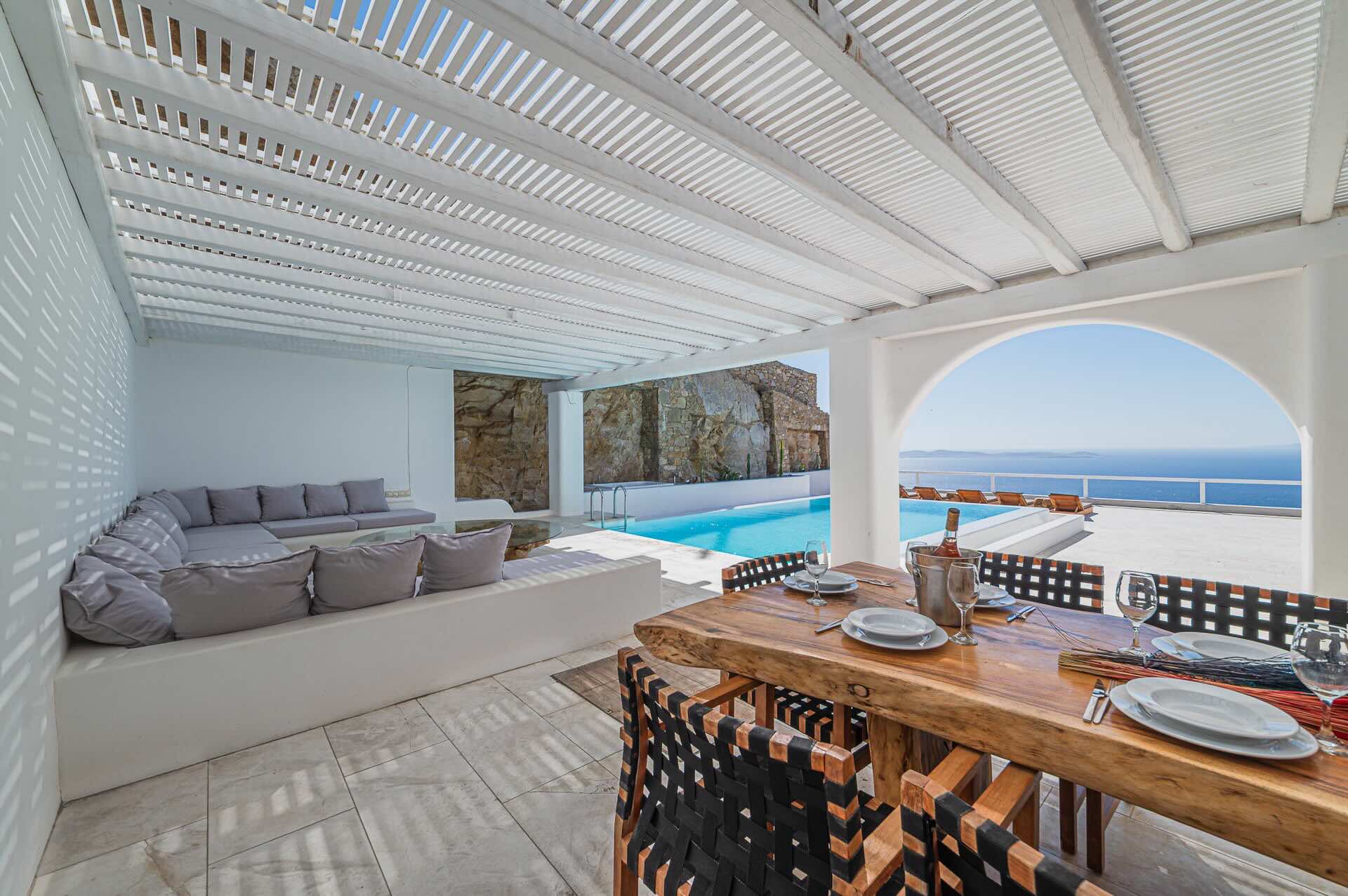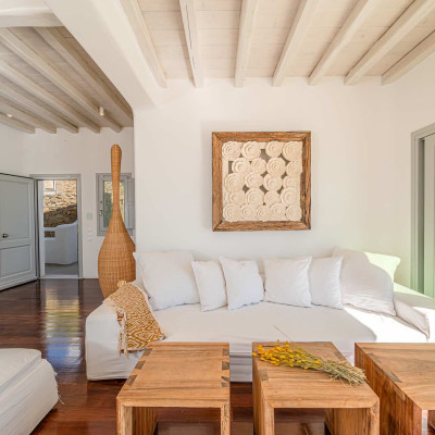 The Cycladic Mykonian architecture of this beautiful villa, in combination with the modern furniture, creates an elegant result as well as an impressive atmosphere.