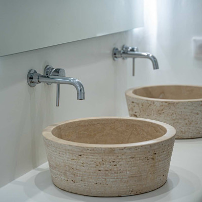 The 50 sq. meter infinity pool, offering breathtaking sunset views of the Aegean Sea, is the centerpiece of the villa's grounds. Complementing the pool is a spacious dining area with seating for 12, along with multiple shaded lounge spaces beneath beautiful pergolas. These areas are perfect for relaxation during the day or hosting romantic dinners and cocktail events in the evening. Surrounded by natural rocky landscapes, the villa's outdoor design creates a serene and luxurious environment, blending seamlessly with nature to deliver a unique experience.