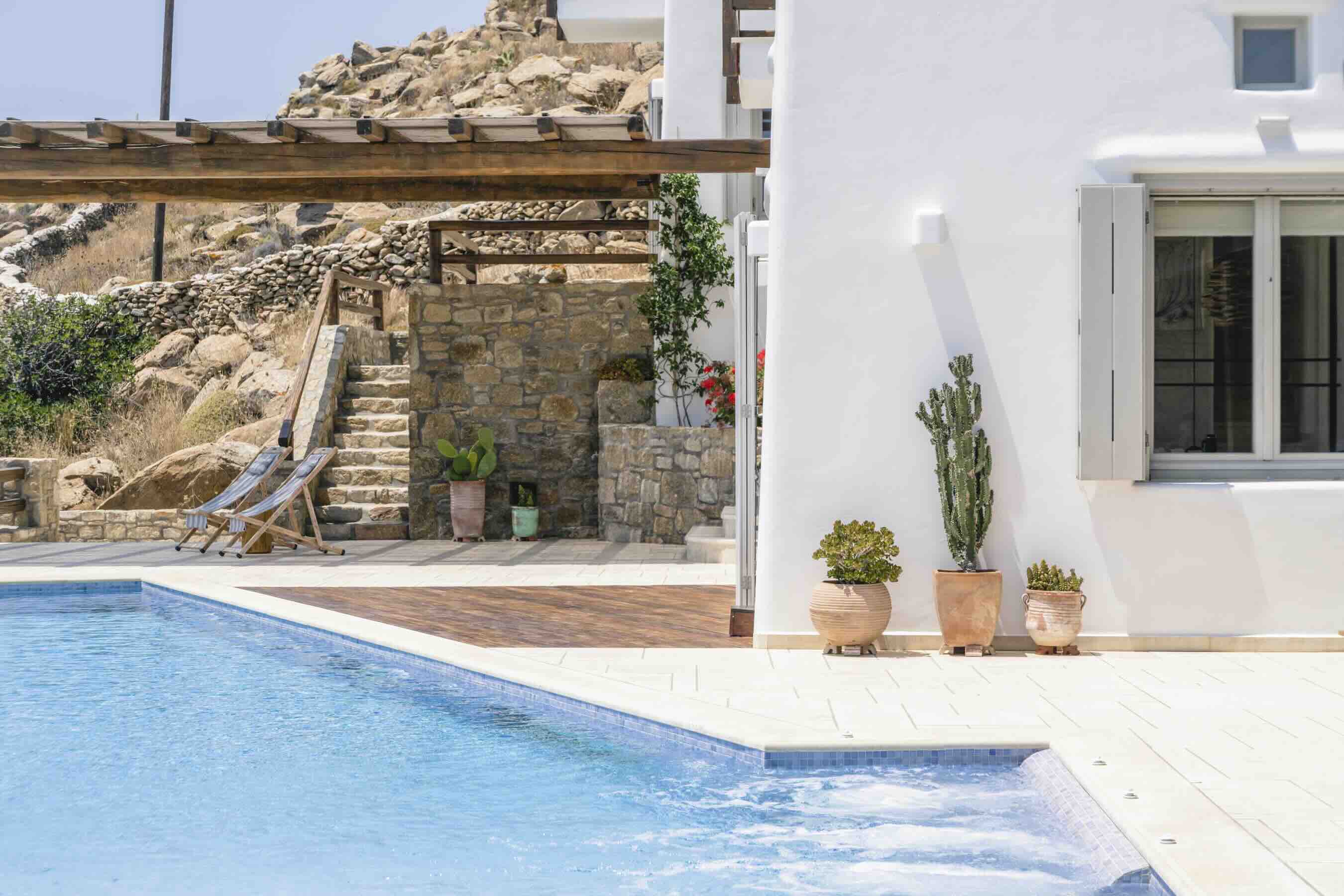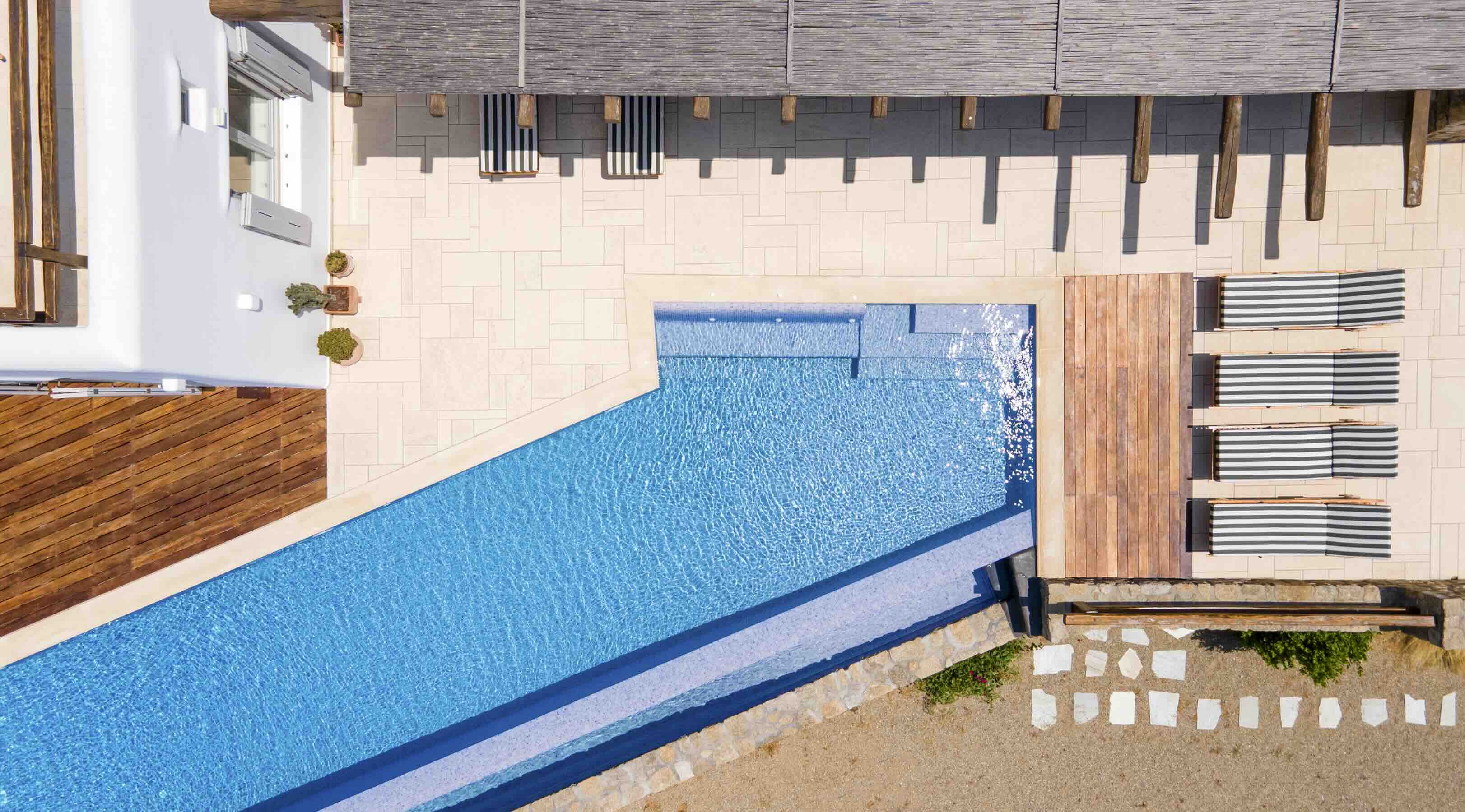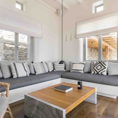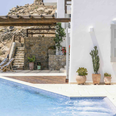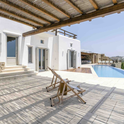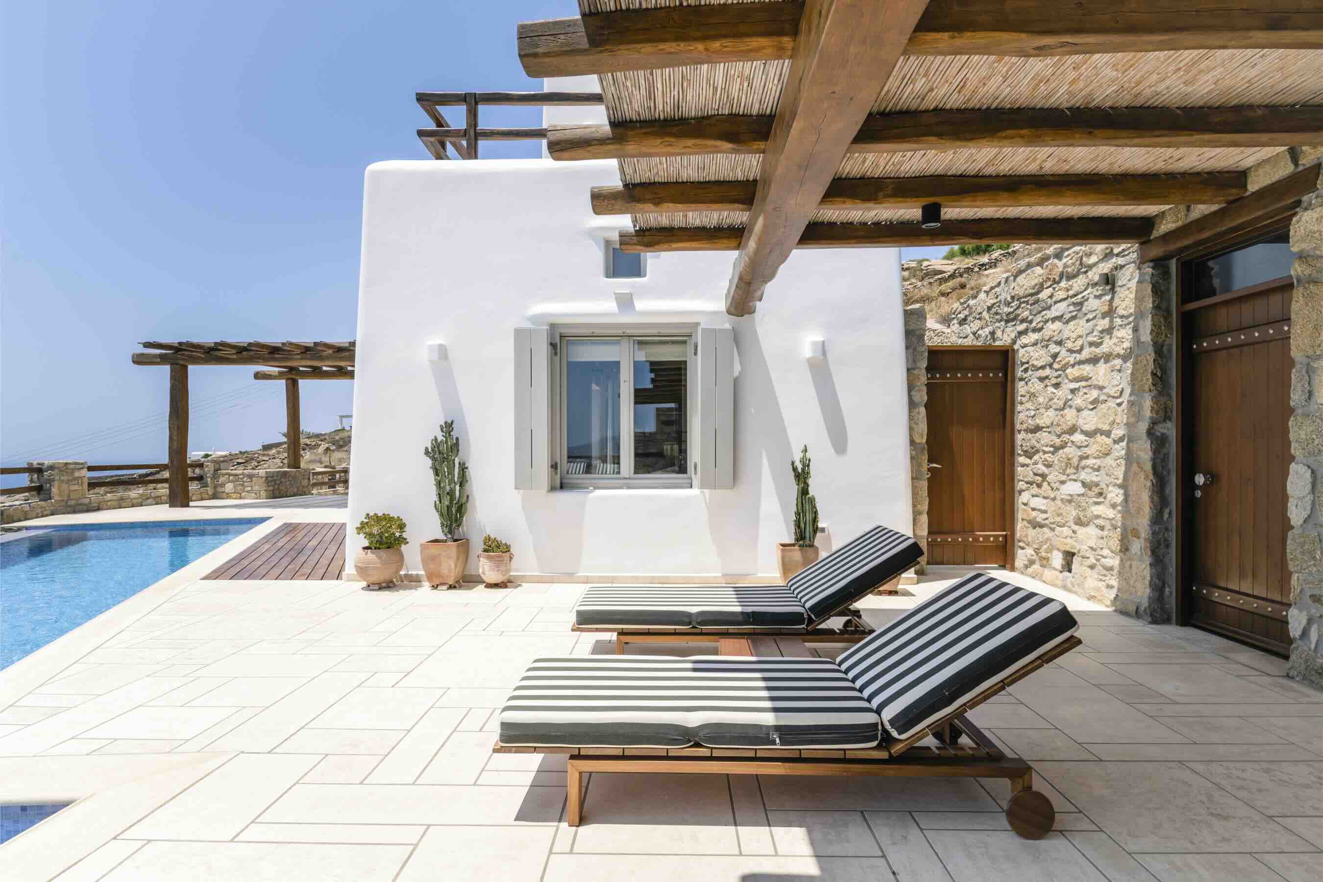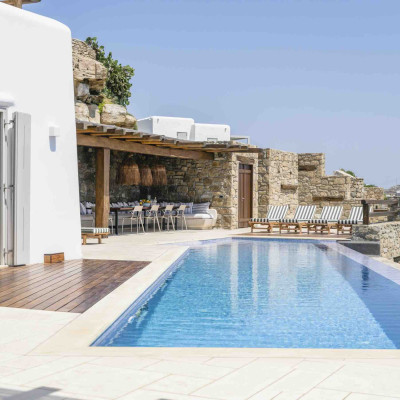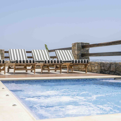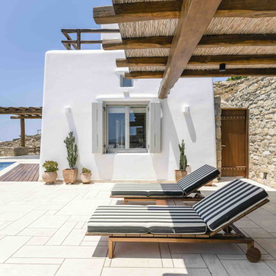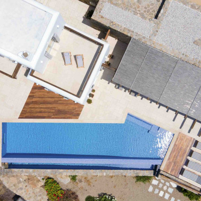 The outdoor common areas consist mainly of the private swimming pool, a spacious, relaxing, and romantic environment, designed to contribute to your rejuvenation during your vacation on Mykonos Island. Swim in the comfortable swimming pool of the villa and enjoy the Mediterranean sun in one of the cozy sun lounges around the pool.