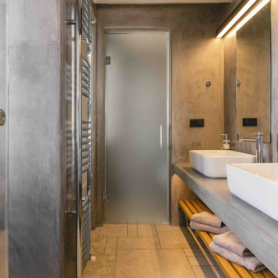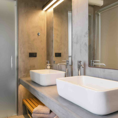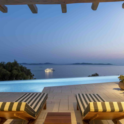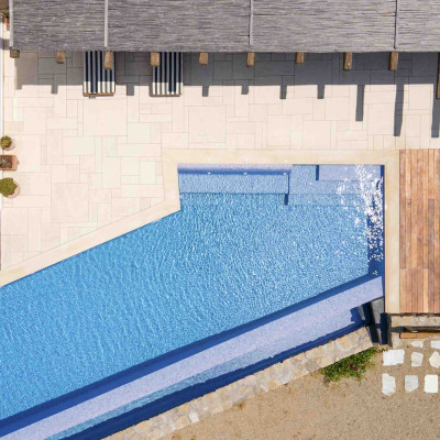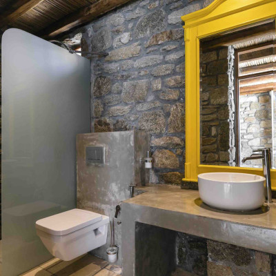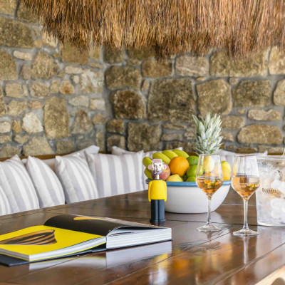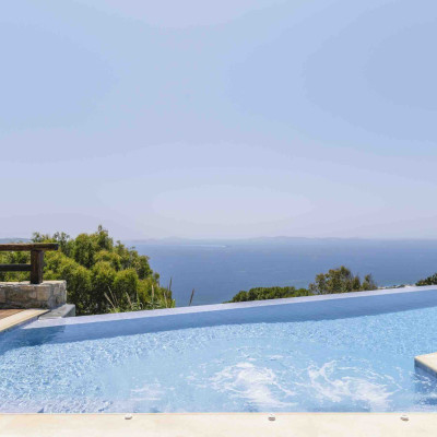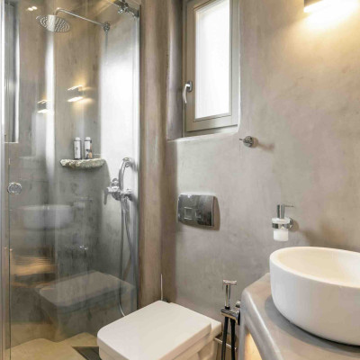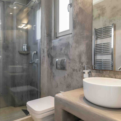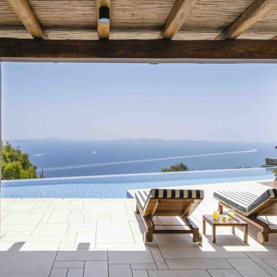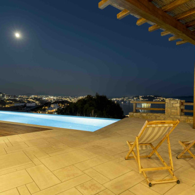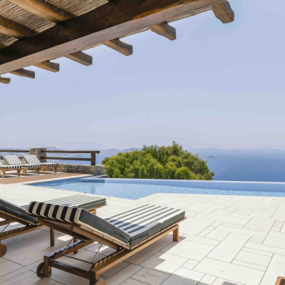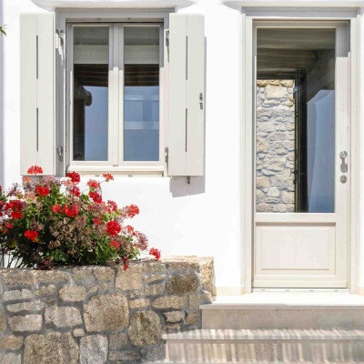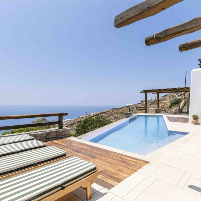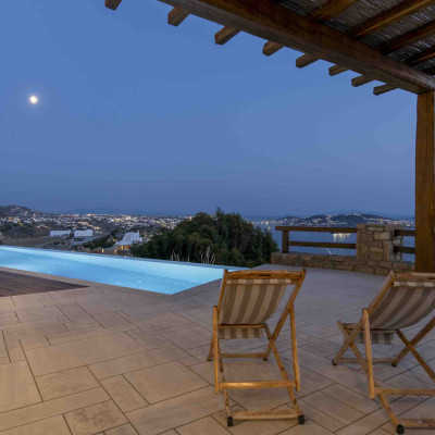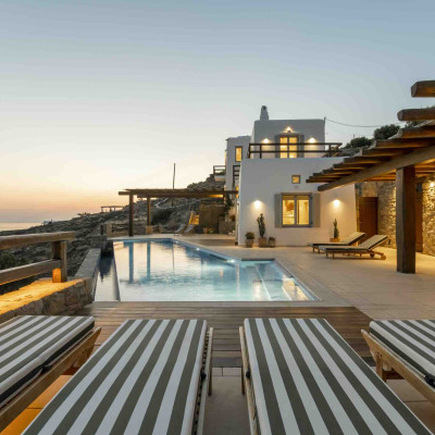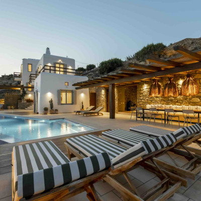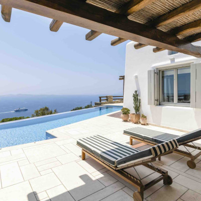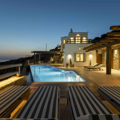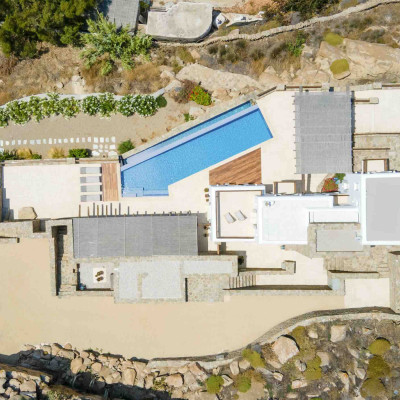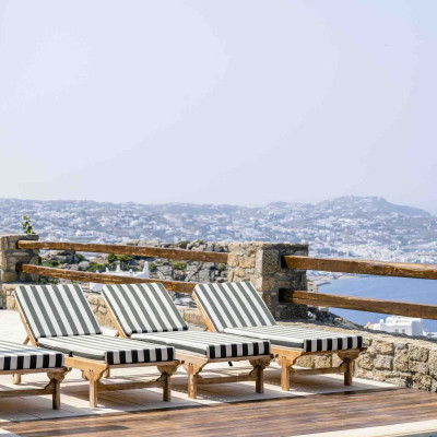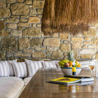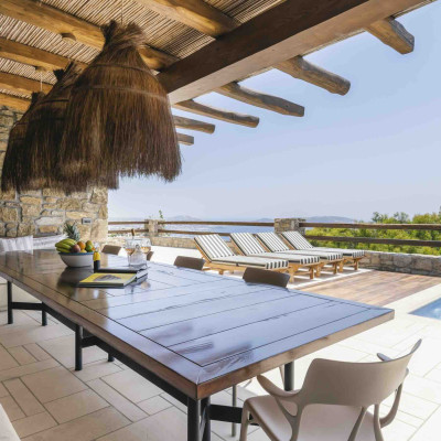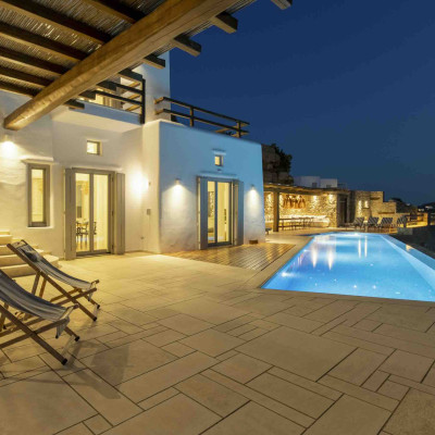 The outdoor common areas consist mainly of the private swimming pool, a spacious, relaxing, and romantic environment, designed to contribute to your rejuvenation during your vacation on Mykonos Island. Swim in the comfortable swimming pool of the villa and enjoy the Mediterranean sun in one of the cozy sun lounges around the pool.