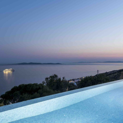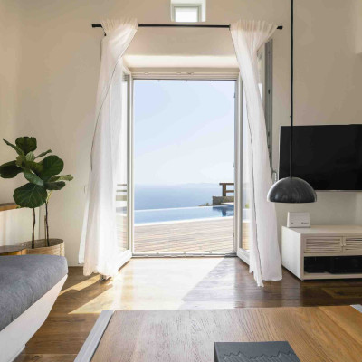 Villa Olivia is located at the Tourlos area of Mykonos offering unlimited sunset and sea views. The villa consists of 3 fully equipped bedrooms with ensuite bathrooms that may accommodate up to 6 guests. The interiors follow the white minimalist design with white surfaces and modern facilities.The exterior lounge and pool areas feature a shallow end private pool with a sunset view, offers a luxury living experience.
