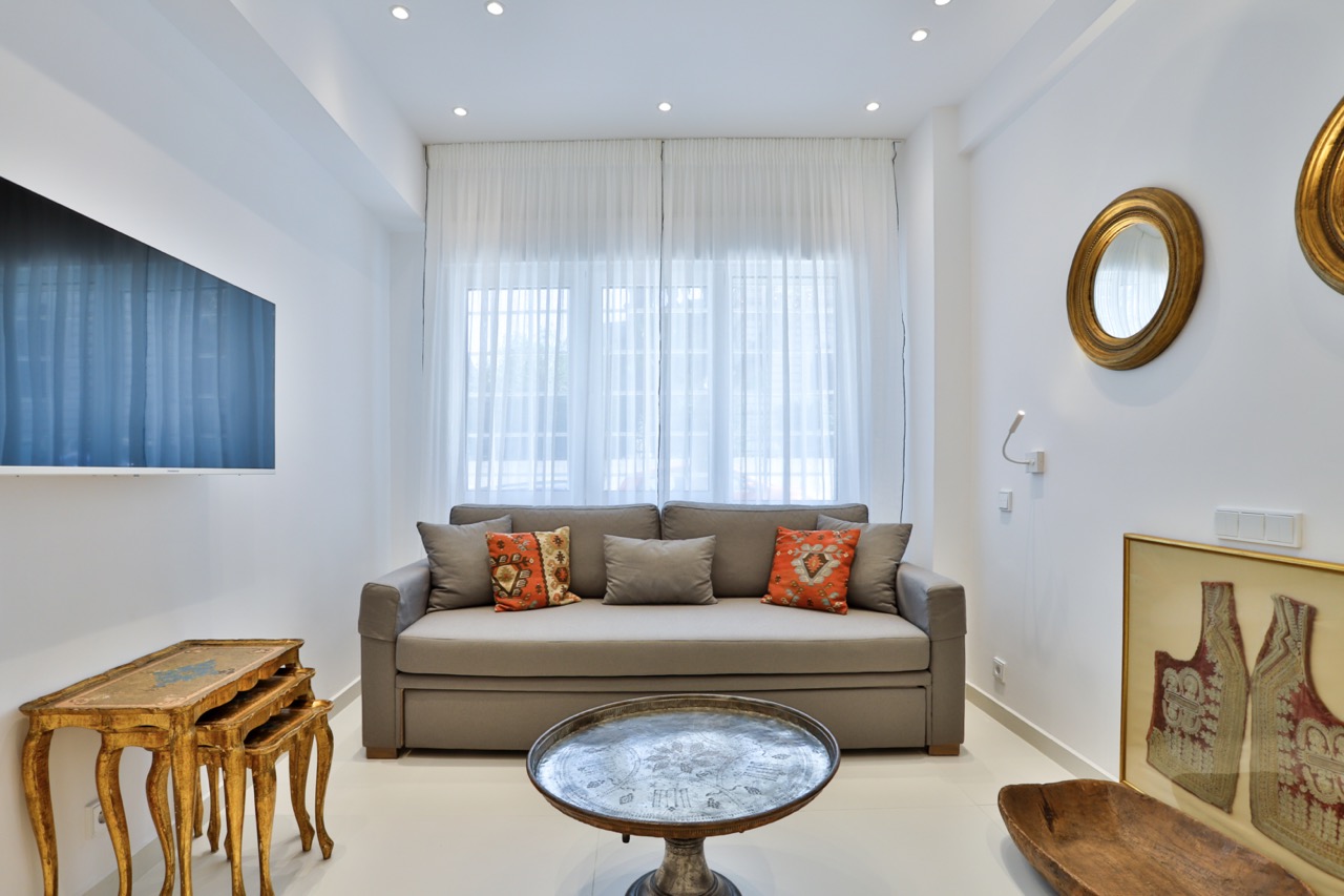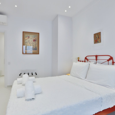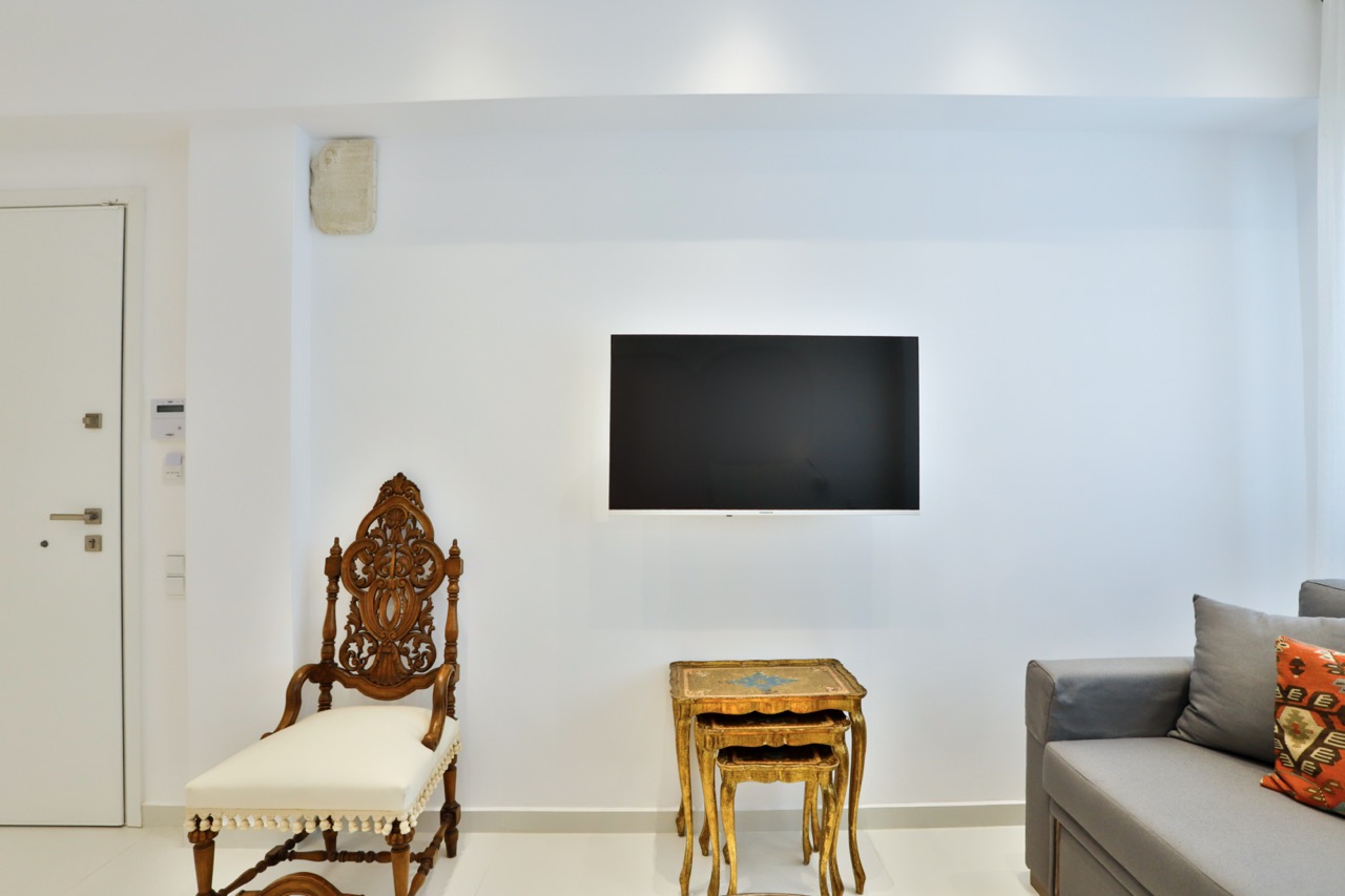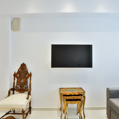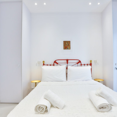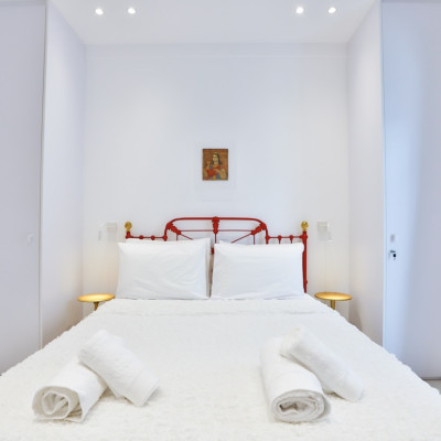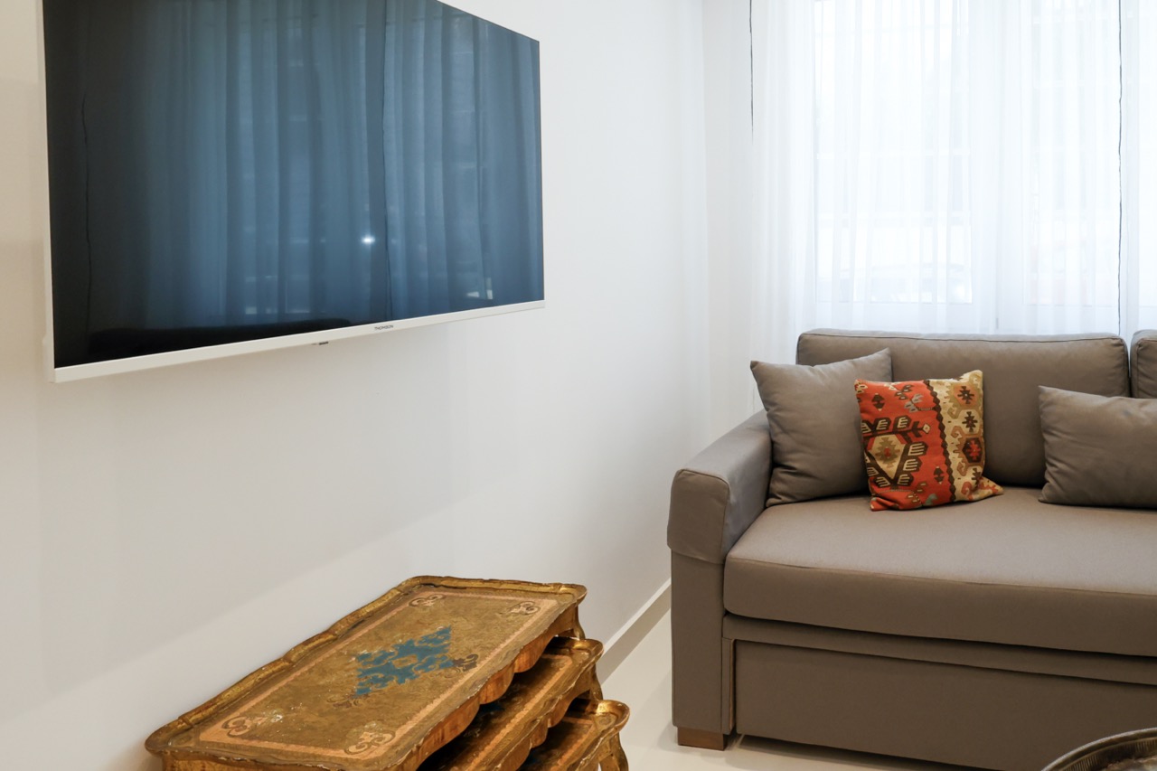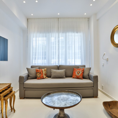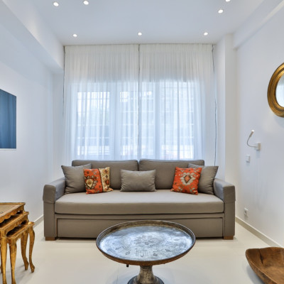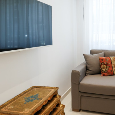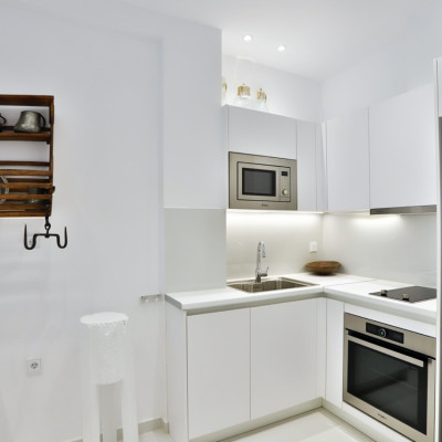 This refined one-bedroom apartment blends neoclassical charm with contemporary design. It features a queen-size bed and a comfortable sofa bed, accommodating up to four guests. The fully equipped kitchen includes all modern appliances for an easy, home-like stay, while the modern bathroom is fitted with elegant fixtures and amenities.