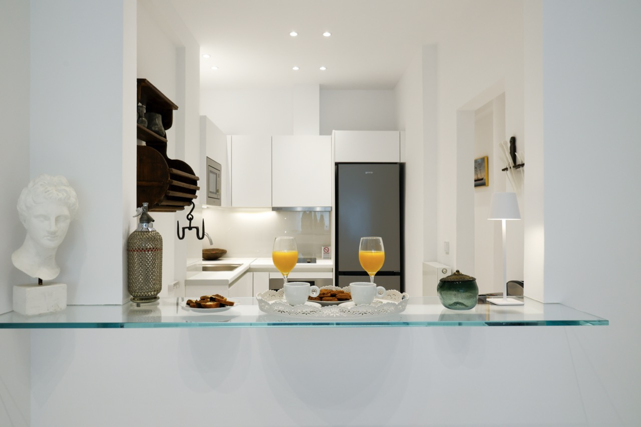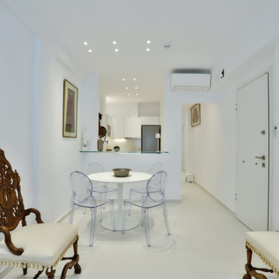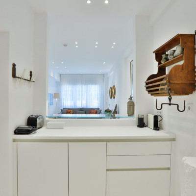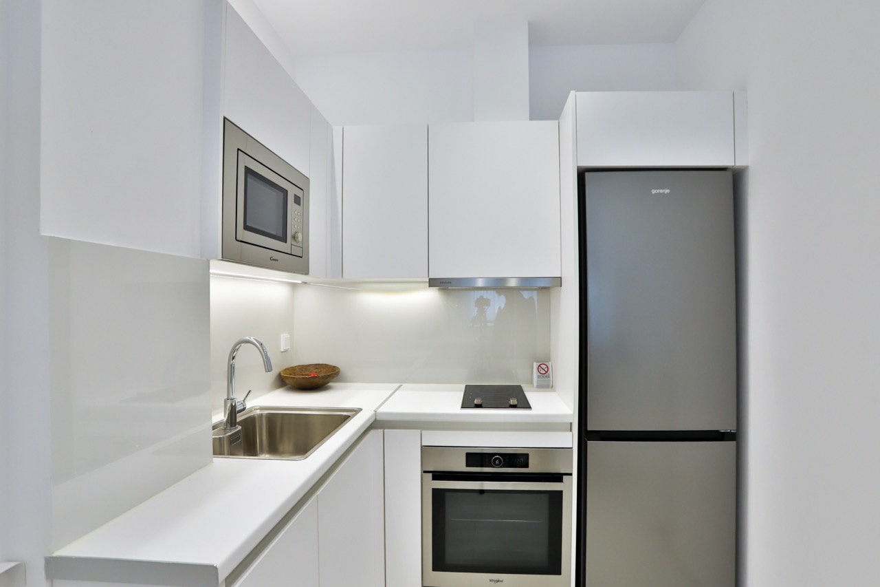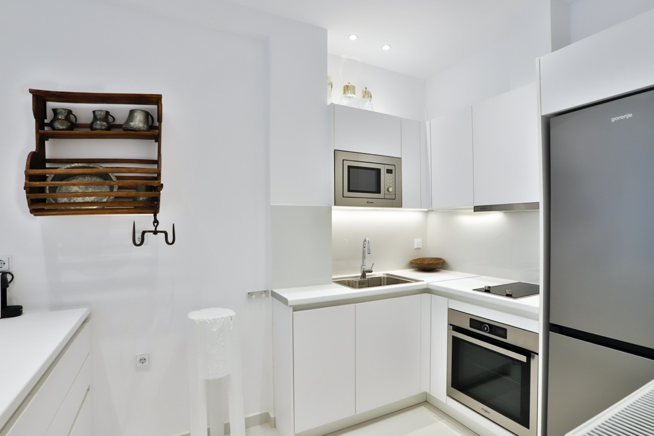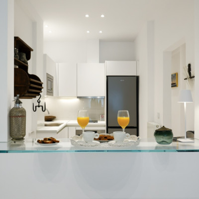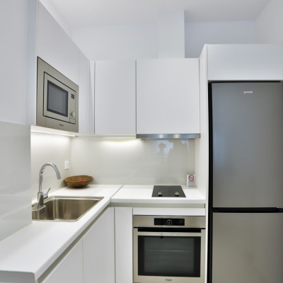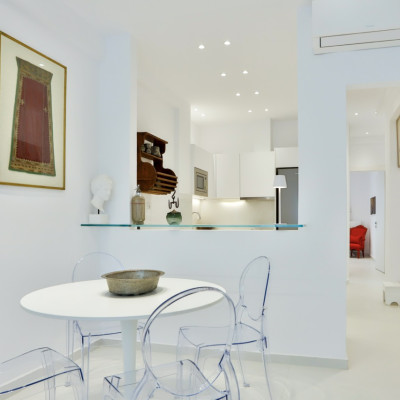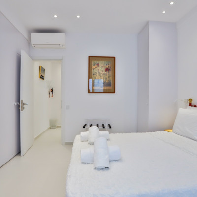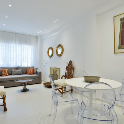 This refined one-bedroom apartment blends neoclassical charm with contemporary design. It features a queen-size bed and a comfortable sofa bed, accommodating up to four guests. The fully equipped kitchen includes all modern appliances for an easy, home-like stay, while the modern bathroom is fitted with elegant fixtures and amenities.