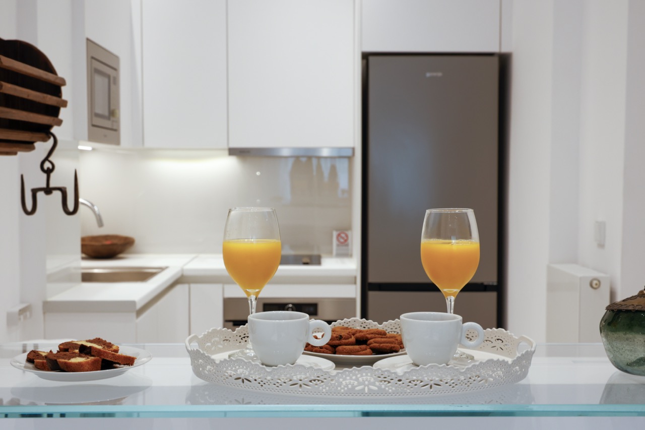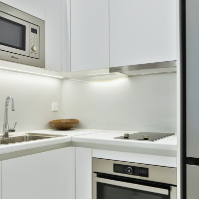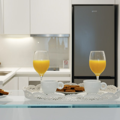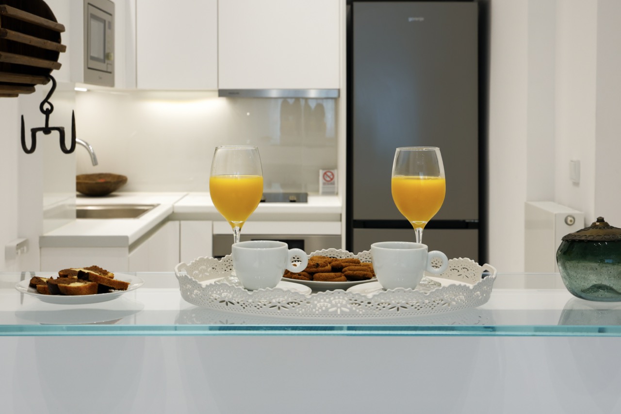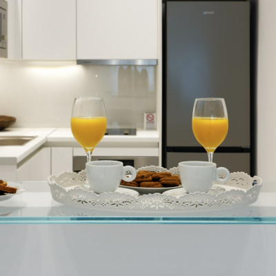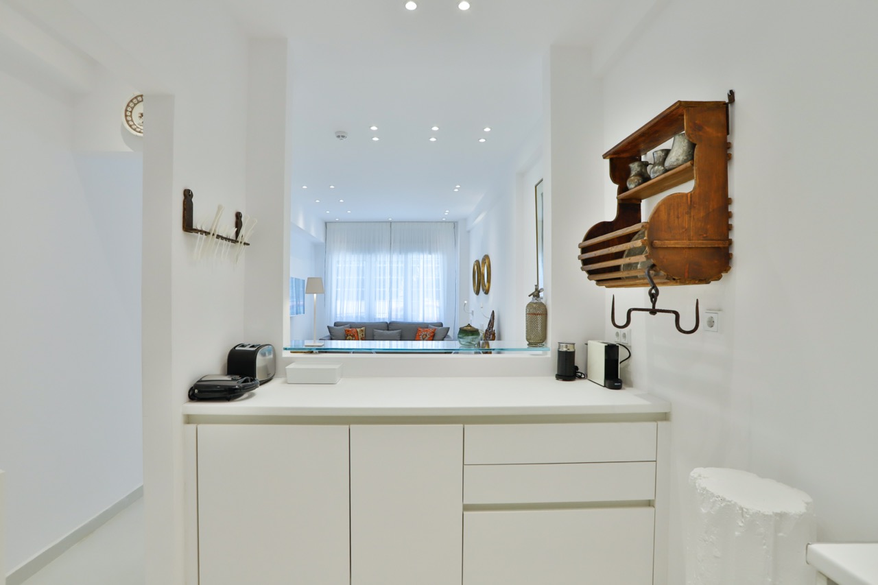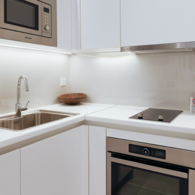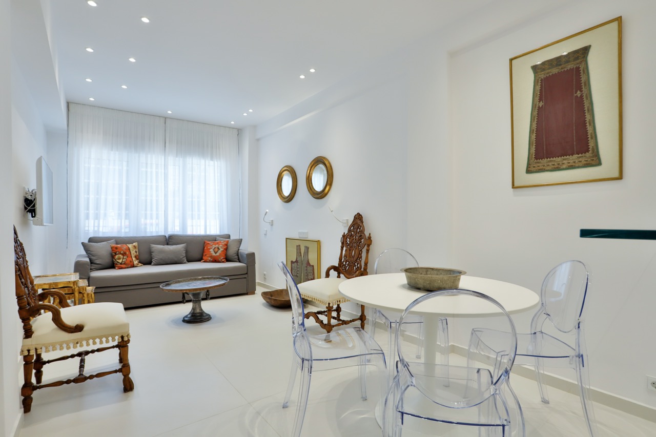 This refined one-bedroom apartment blends neoclassical charm with contemporary design. It features a queen-size bed and a comfortable sofa bed, accommodating up to four guests. The fully equipped kitchen includes all modern appliances for an easy, home-like stay, while the modern bathroom is fitted with elegant fixtures and amenities.
