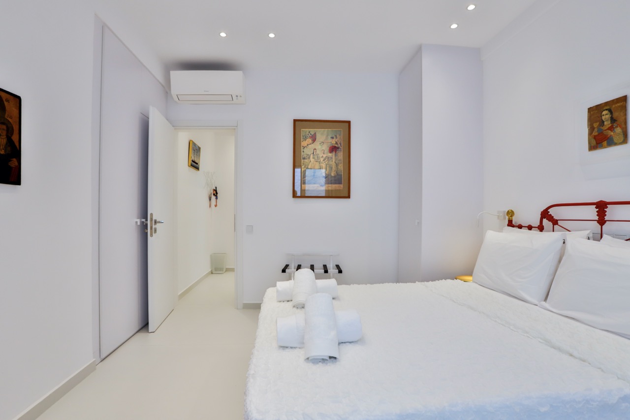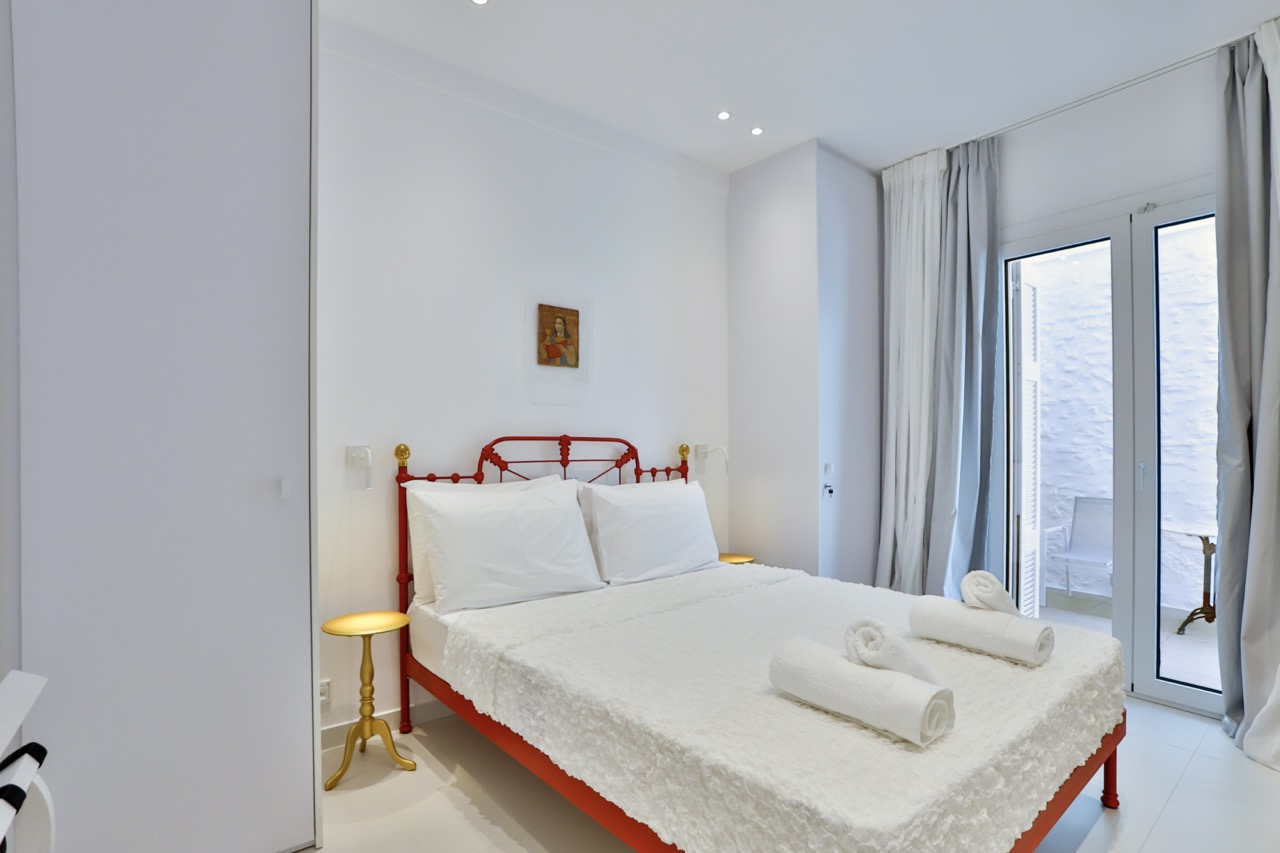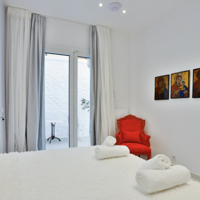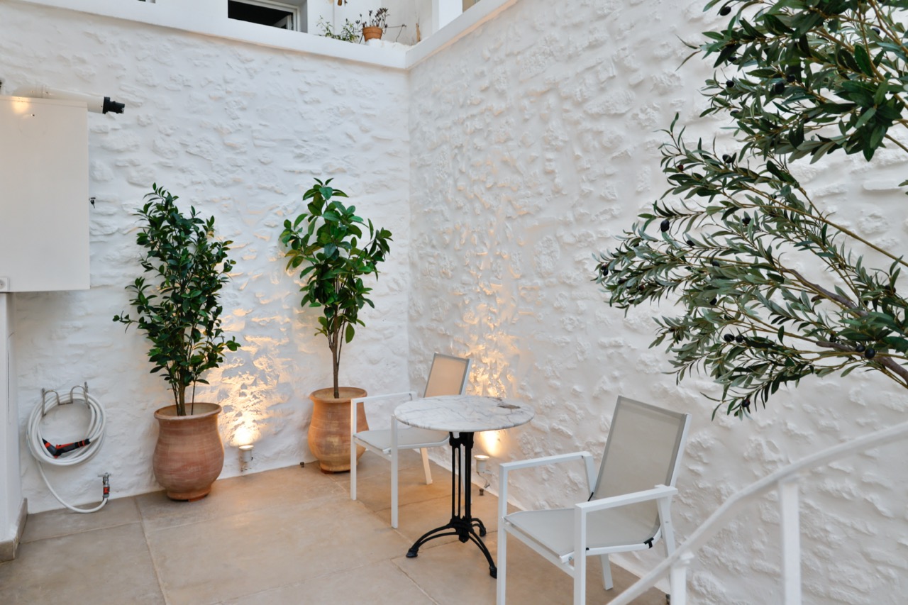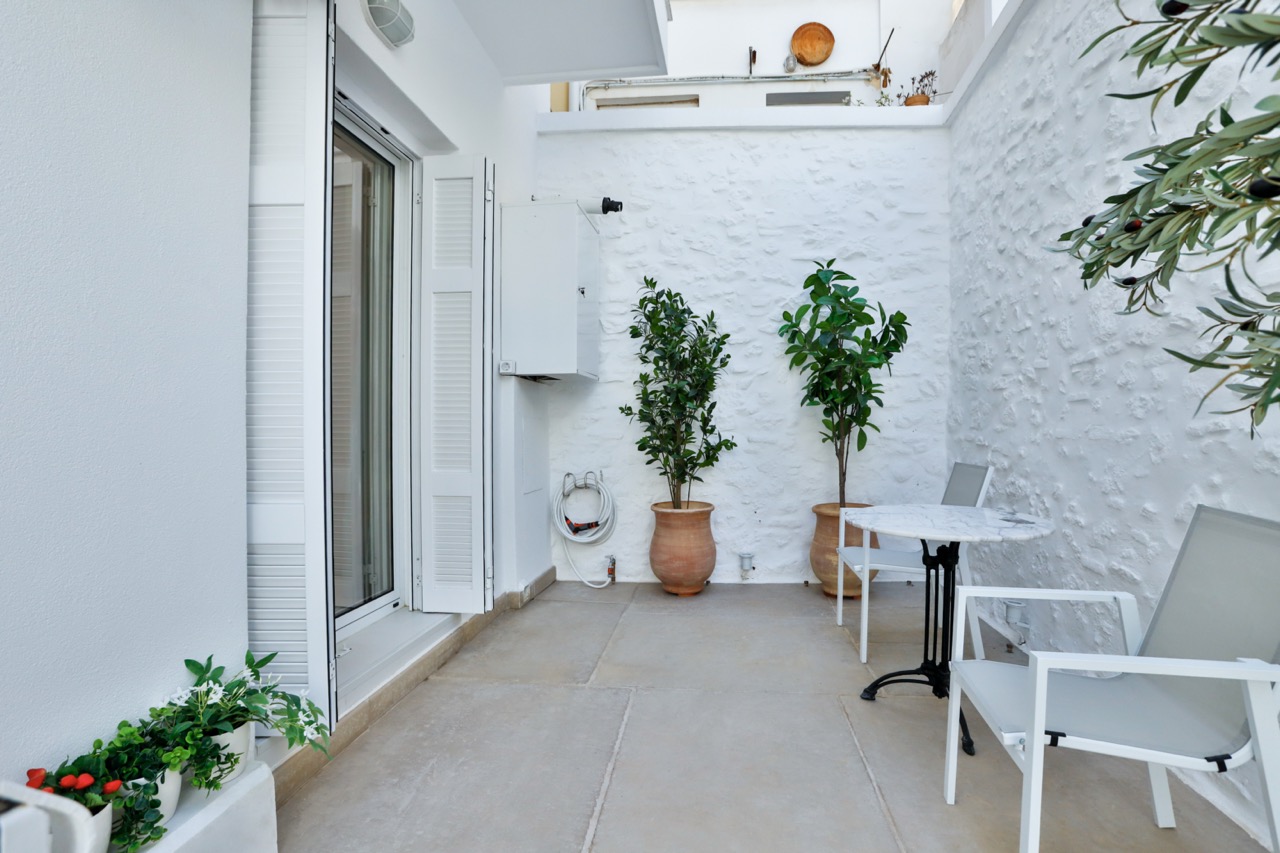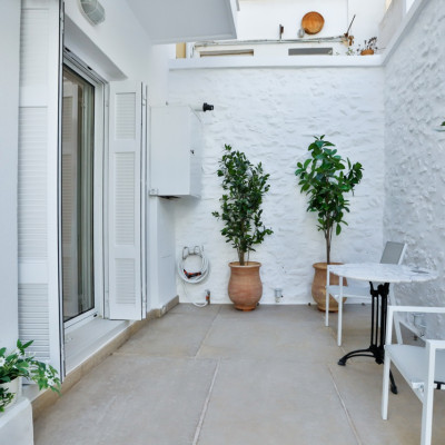What makes this unit truly special is its private garden patio — a small green oasis ideal for morning coffee or quiet evenings under the Athenian sky. High ceilings, antique accents, and warm tones complete the atmosphere of discreet elegance. Perfect for couples, small families, or friends seeking comfort and authenticity just steps from the Acropolis walkway.