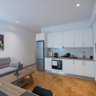 This modern urban apartment offers a bright living room area with a sofa bed, a fully equipped kitchen, a cozy bedroom with a double bed, a sleek bathroom, and a private balcony with city views. Designed for comfort and convenience, it’s an ideal retreat in the heart of the city.