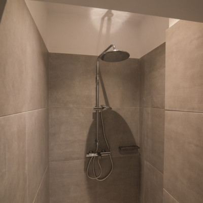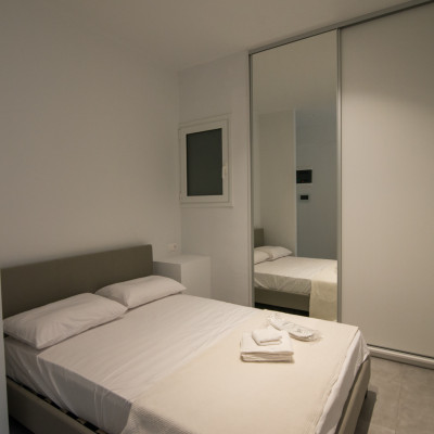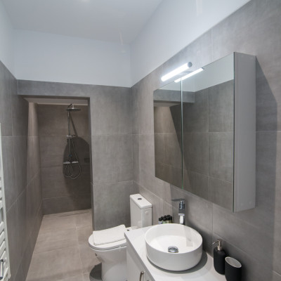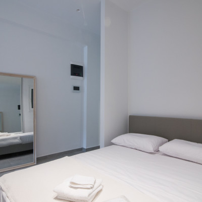 The bedroom is furnished with a double bed, fresh linens, and a large wardrobe for storage. The sleek bathroom offers a walk-in shower, complimentary toiletries, fluffy towels, a hairdryer, and other essentials. The apartment is air-conditioned for year-round comfort.
