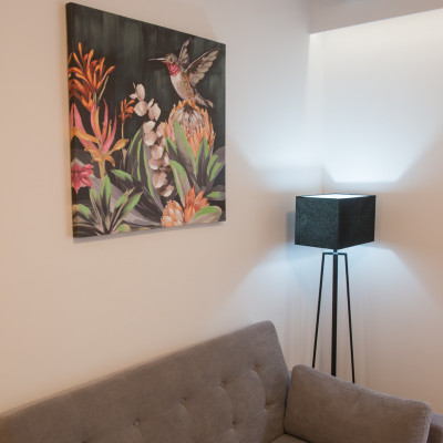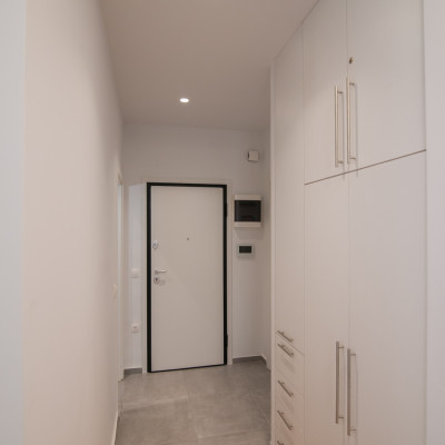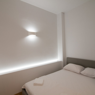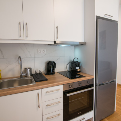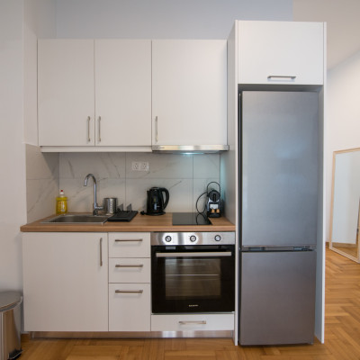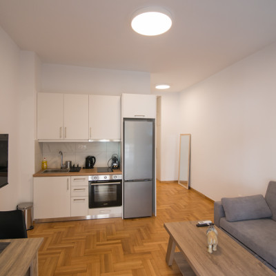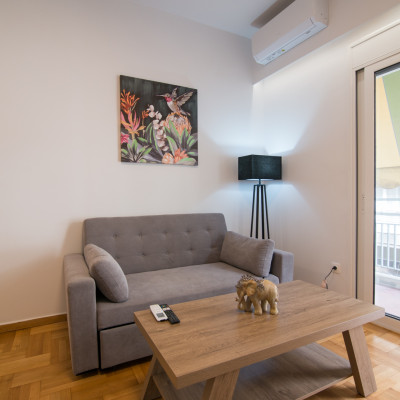 This modern urban apartment offers a bright living room area with a sofa bed, a fully equipped kitchen, a cozy bedroom with a double bed, a sleek bathroom, and a private balcony with city views. Designed for comfort and convenience, it’s an ideal retreat in the heart of the city.