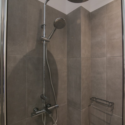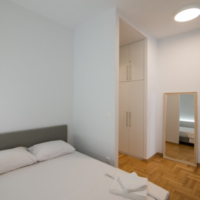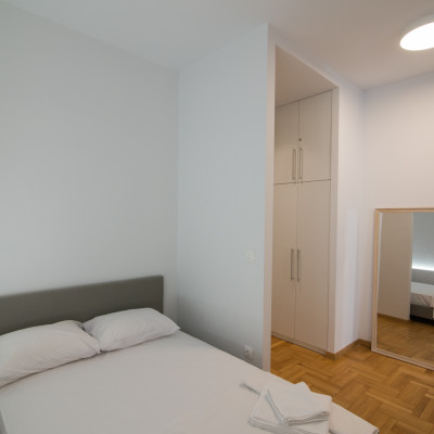 The bedroom is furnished with a double bed, fresh linens, and a large wardrobe for storage. The sleek bathroom offers a walk-in shower, complimentary toiletries, fluffy towels, a hairdryer, and other essentials. The apartment is air-conditioned for year-round comfort.