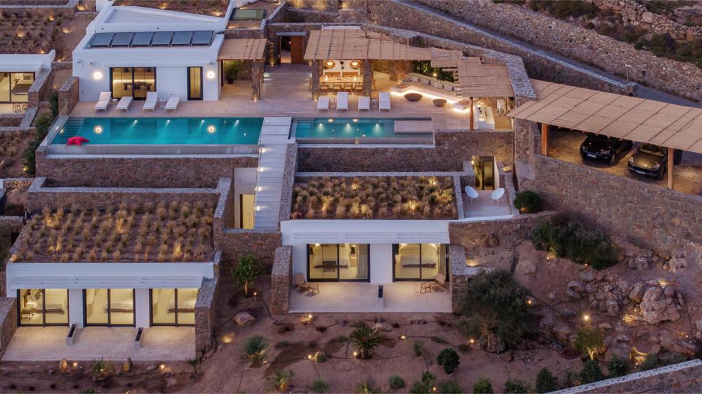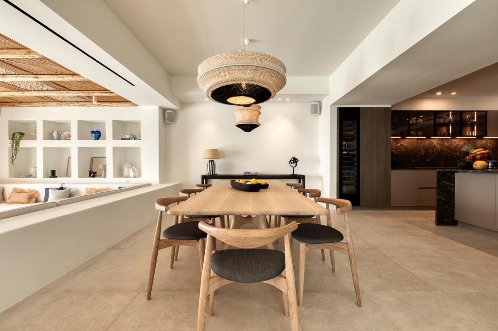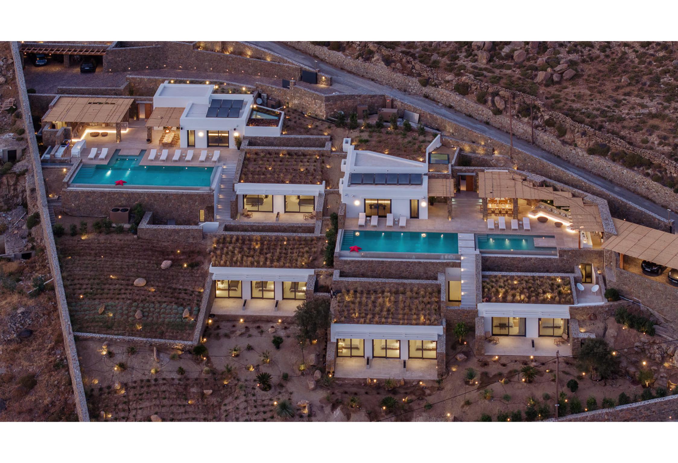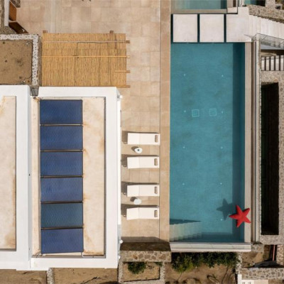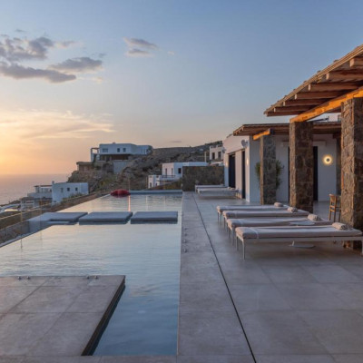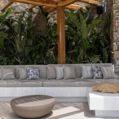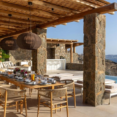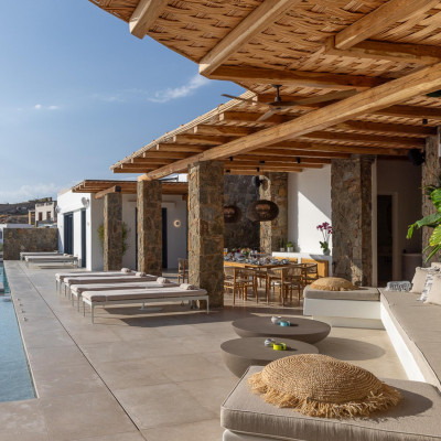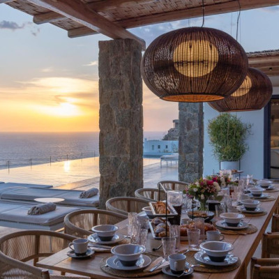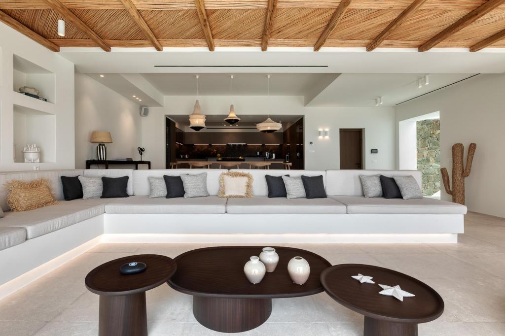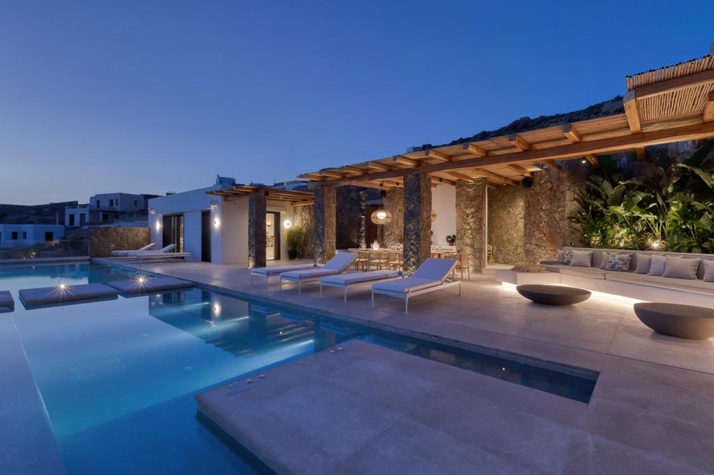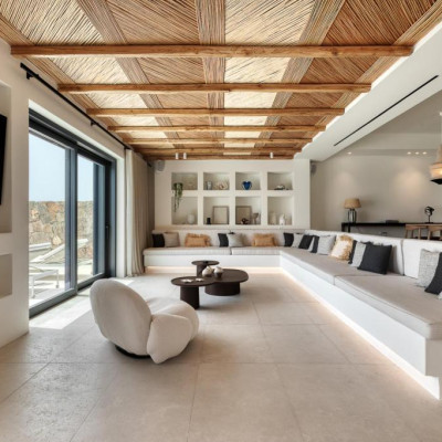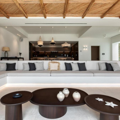 The villa’s outdoor areas are a sanctuary of serenity and luxury. Centered around a heated infinity pool, the expansive terrace features stylish sun loungers, a shaded alfresco dining area, and cozy lounge spots, perfect for entertaining or quiet reflection. Panoramic views of the Aegean Sea and magical sunsets set the stage for unforgettable moments.