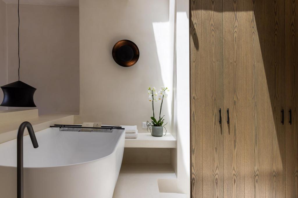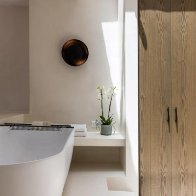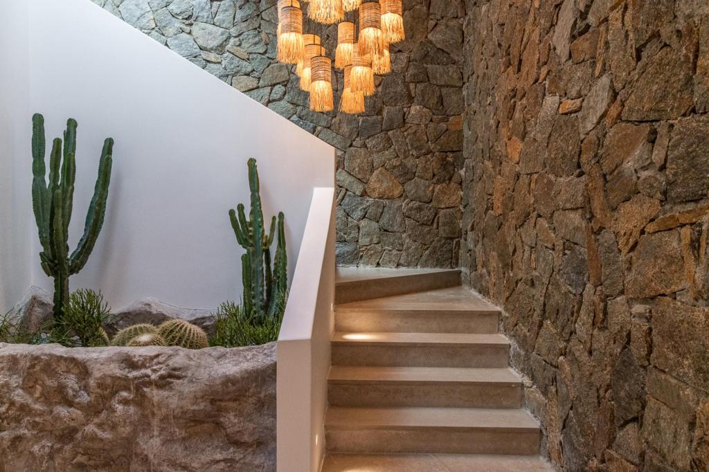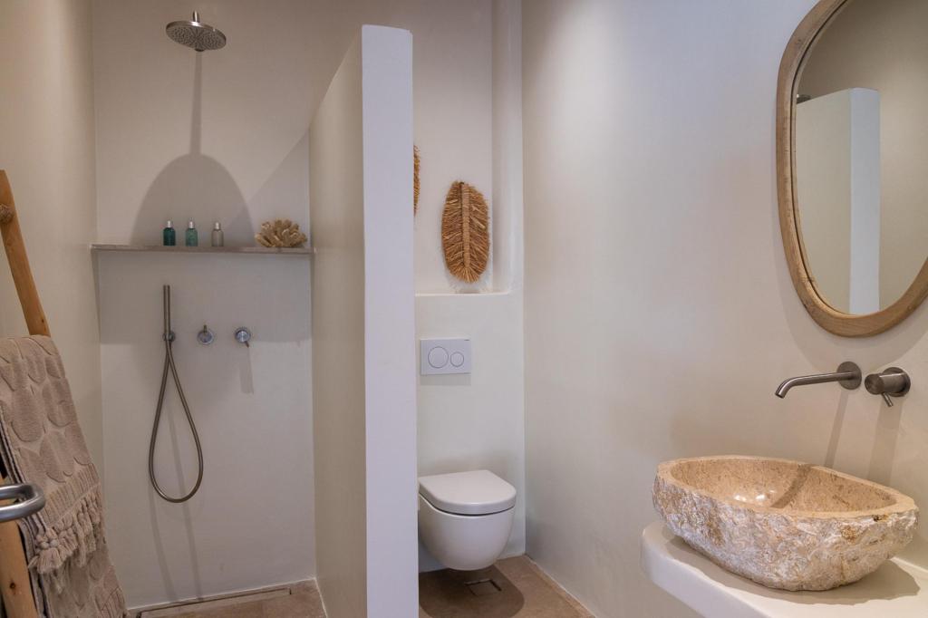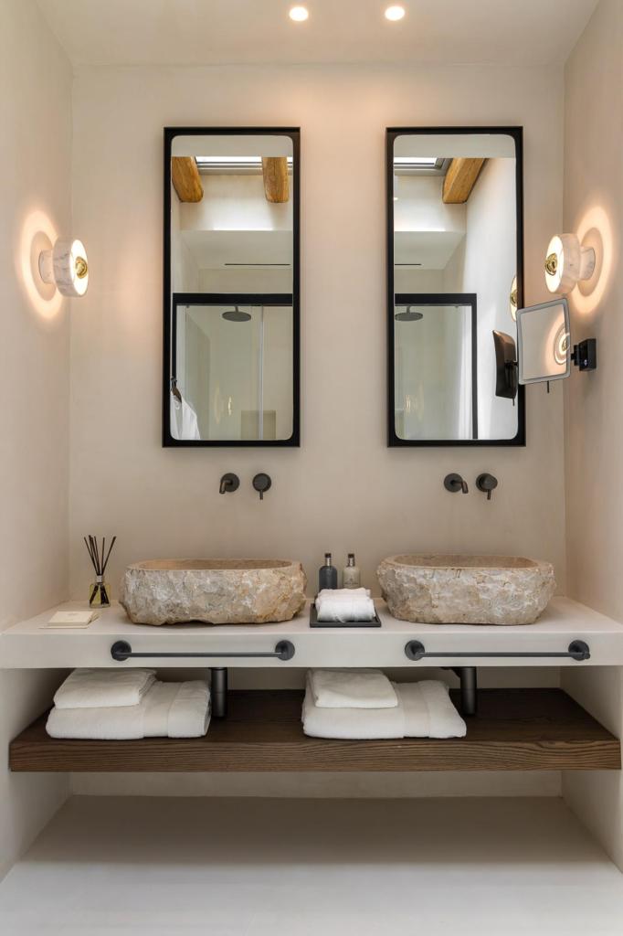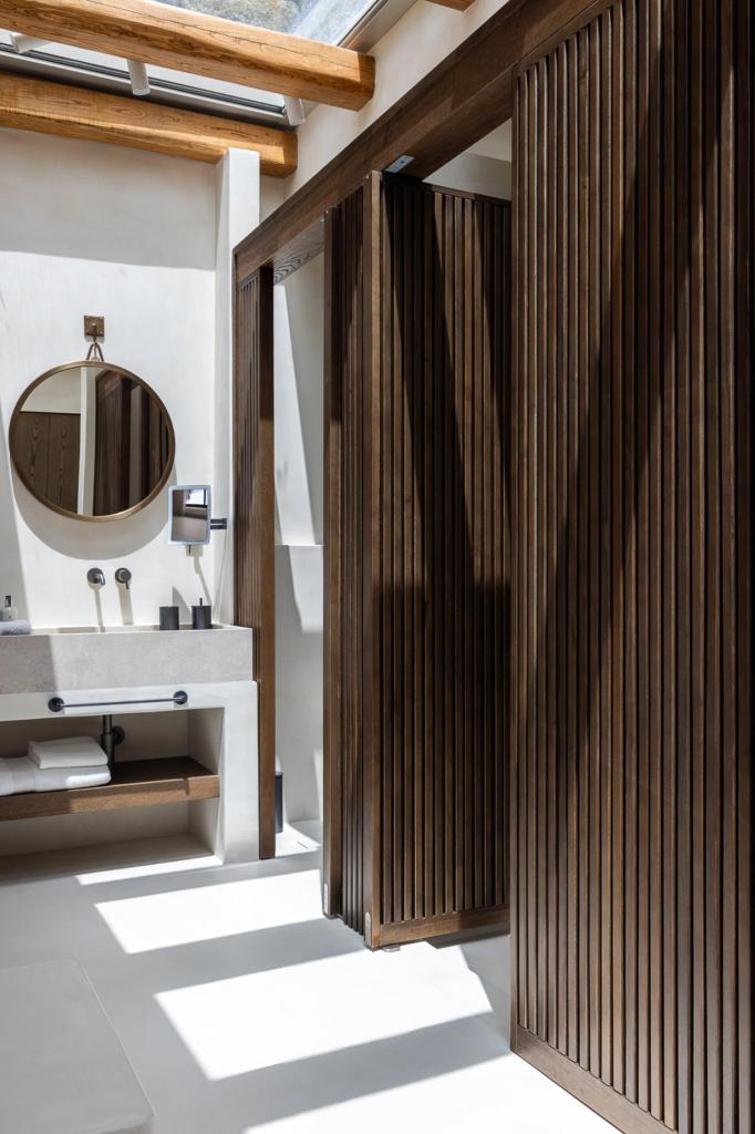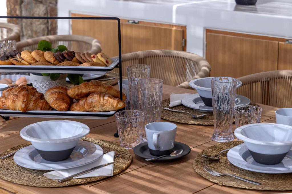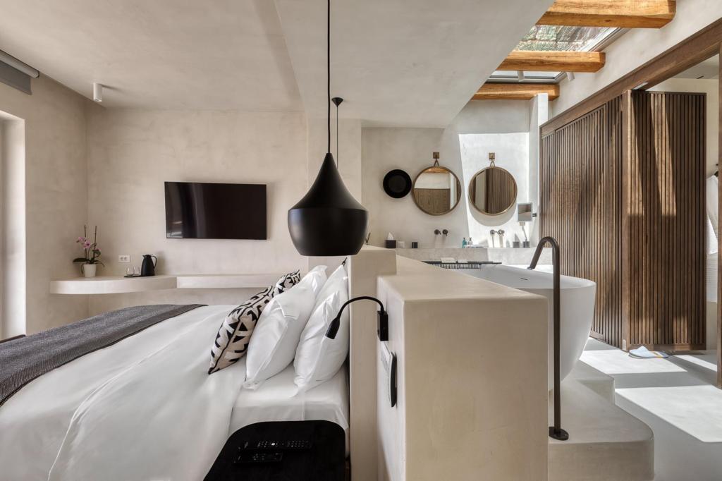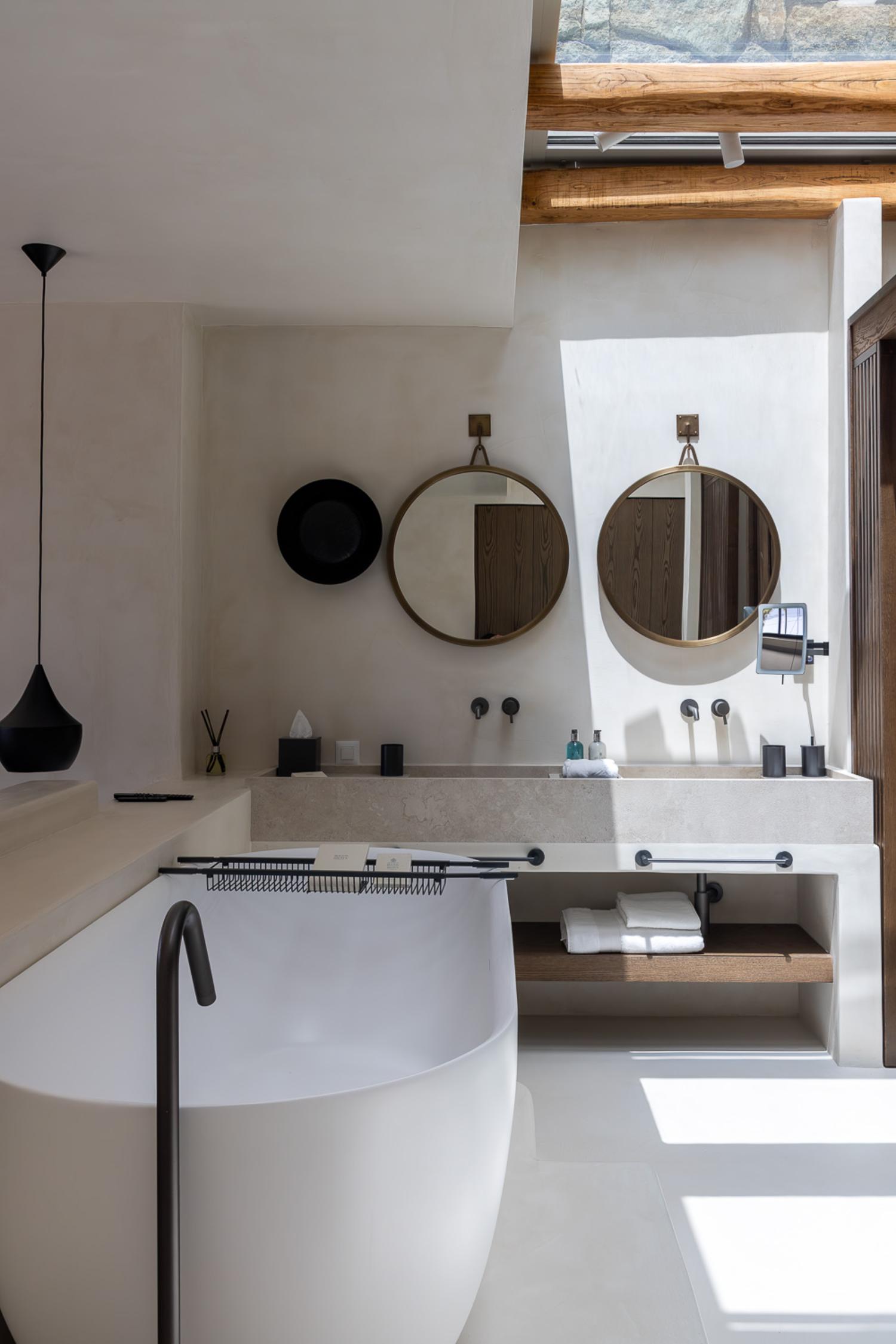 The villa’s outdoor areas are a sanctuary of serenity and luxury. Centered around a heated infinity pool, the expansive terrace features stylish sun loungers, a shaded alfresco dining area, and cozy lounge spots, perfect for entertaining or quiet reflection. Panoramic views of the Aegean Sea and magical sunsets set the stage for unforgettable moments.