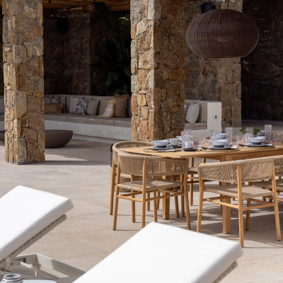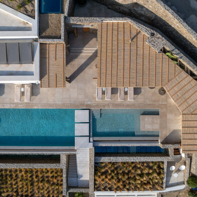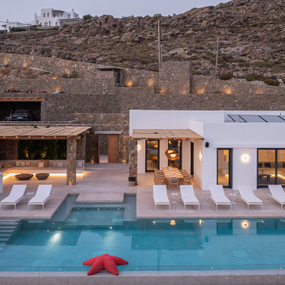 Conveniently located near Mykonos Town and the island's famous beaches, this luxurious villa offers 7 sumptuous bedrooms, designed to host up to 14 adults and 10 children, accommodating a total of 24 guests. The villa also boasts 8 elegant bathrooms, a spacious open-plan living and dining area seamlessly connected to the pool terrace, and a gourmet kitchen outfitted with premium appliances and an adjoining pantry.