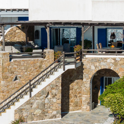 Welcome to a refined beachfront escape in Mykonos, ideally located in the prestigious area of Aleomandra. This elegant Cycladic-style villa is set within an exclusive seaside complex, offering direct access to the Aegean Sea and access to one of the largest shared swimming pools on the island.