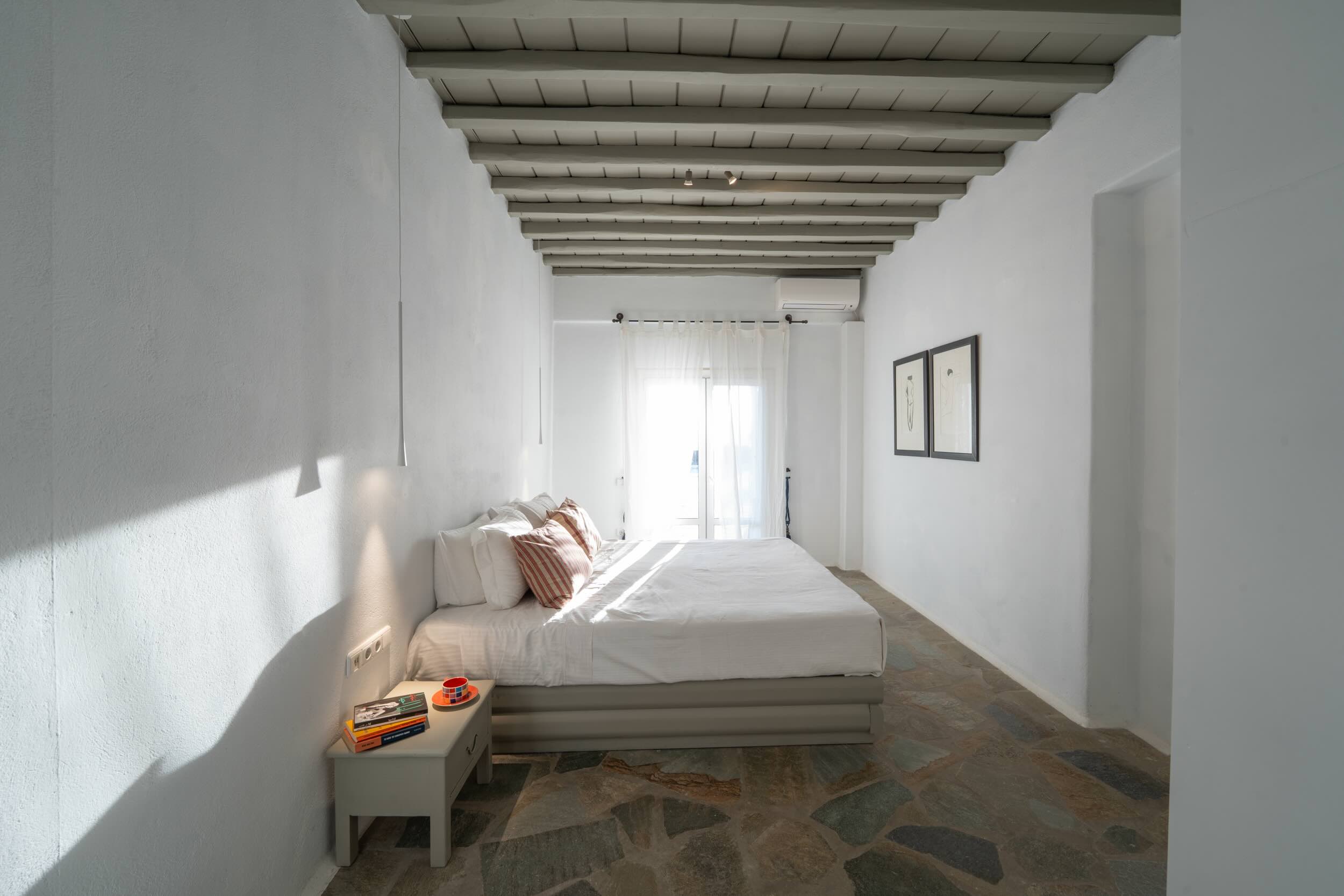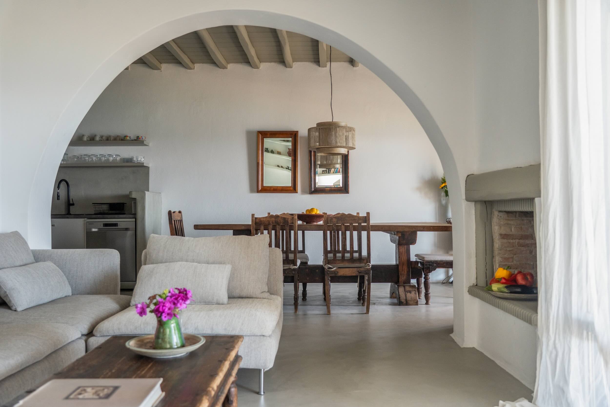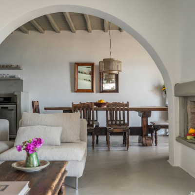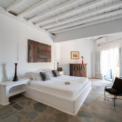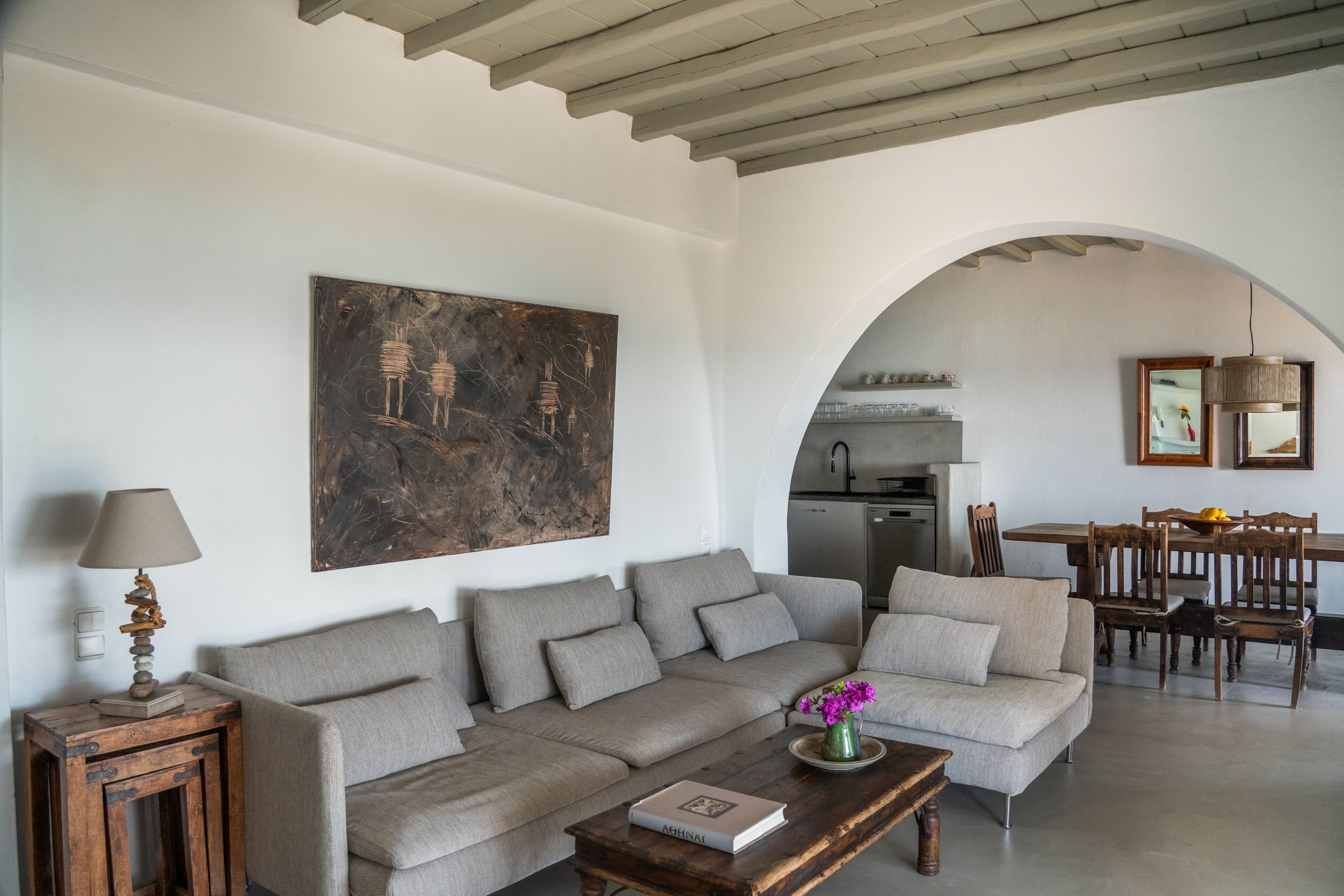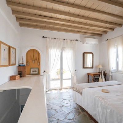 Designed with classic whitewashed architecture and soft, curved lines, the villa blends timeless Cycladic charm with contemporary comfort. It features four spacious bedrooms, each offering privacy, comfort, and beautiful sea views — ideal for families or groups of friends seeking a relaxed yet sophisticated stay.