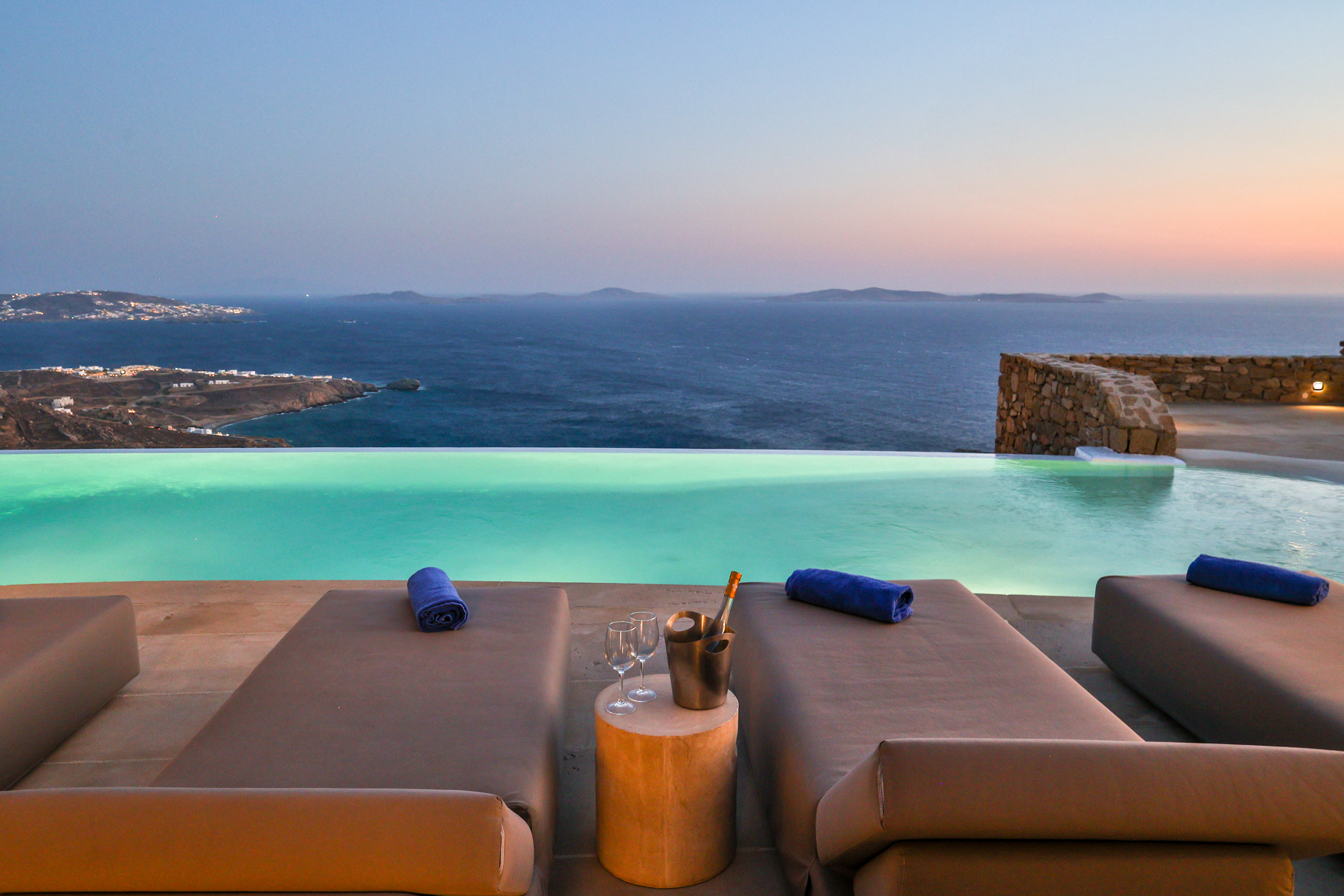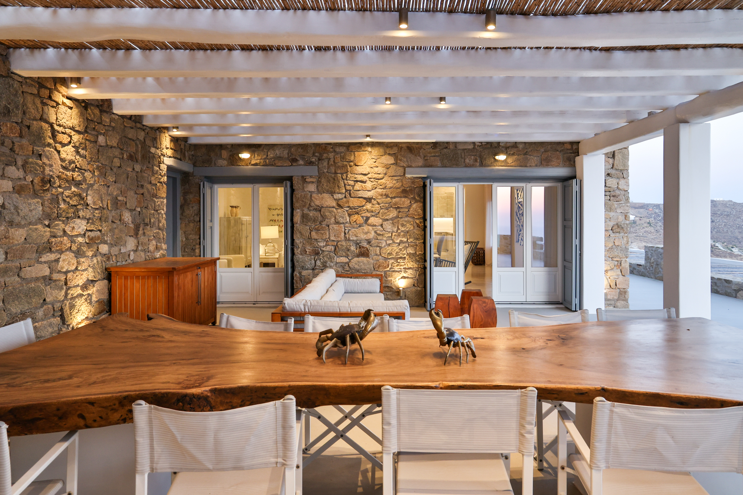 Outdoors, a crystal-clear heated pool becomes the centerpiece for relaxation, entertainment, or a tranquil sunset swim. Expansive terraces invite guests to lounge under the Mykonian sun or gather for evening cocktails, all while taking in sweeping sea views.