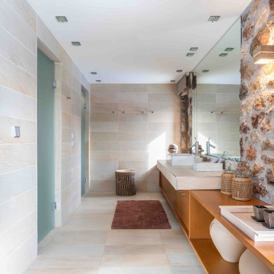 The villa boasts two private pools, expansive terraces for al fresco dining, and direct access to a secluded beach, offering guests the ultimate in relaxation and outdoor living. The panoramic views of the Aegean Sea and lush landscapes create a stunning backdrop for every occasion.