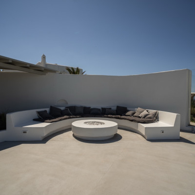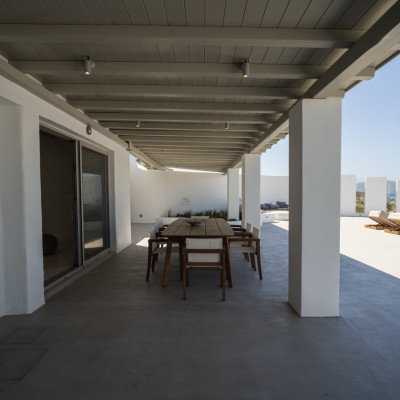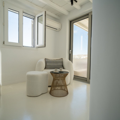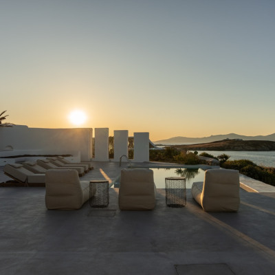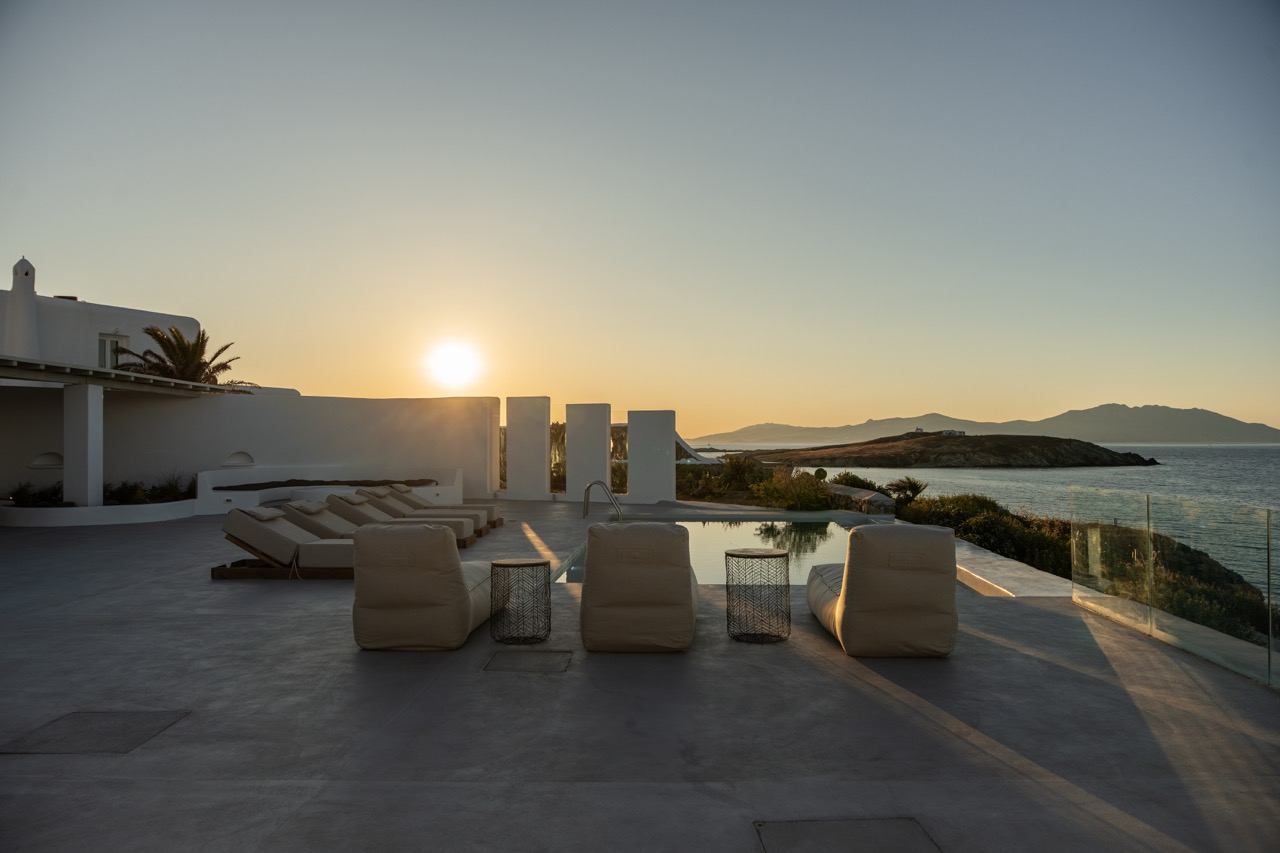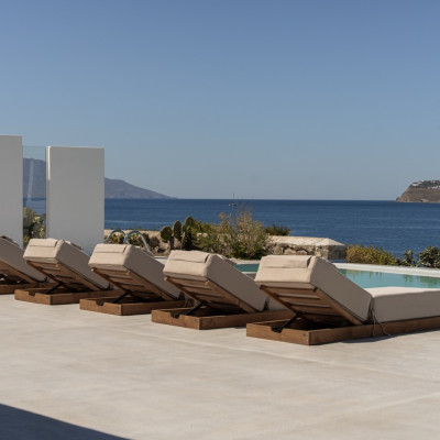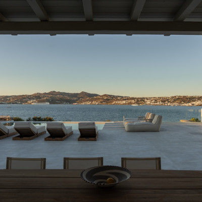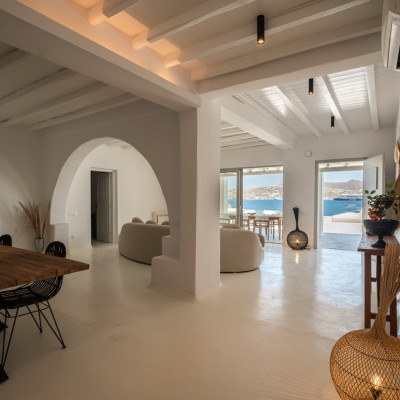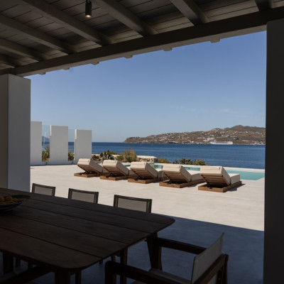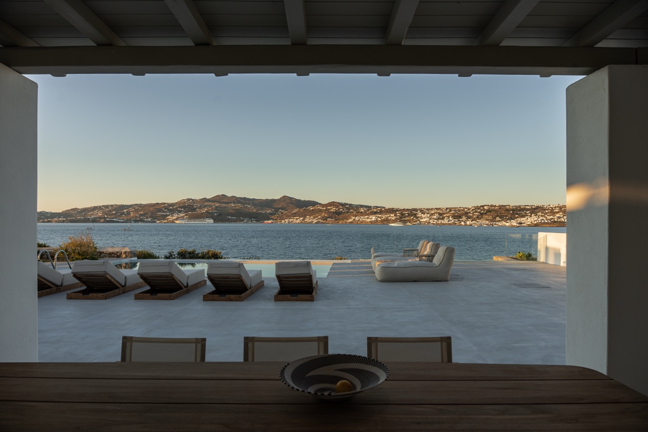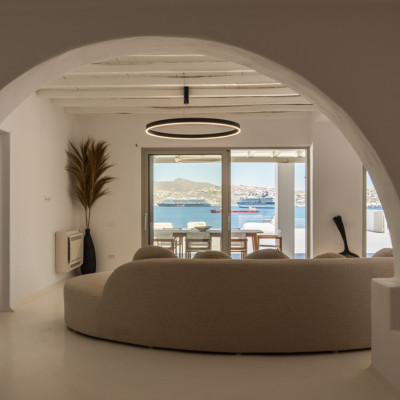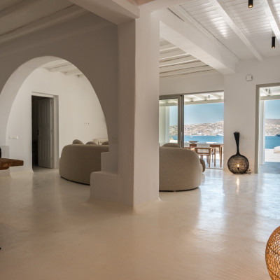 Villa Arcade is a refined sea-view villa in Mykonos, located on a hillside in Kanalia with uninterrupted panoramic views over Delos Island, the Aegean Sea, and Mykonos Town.