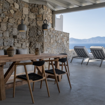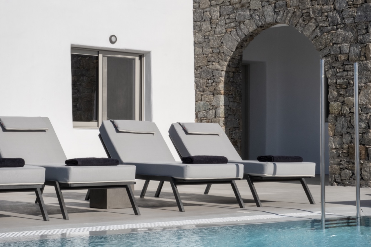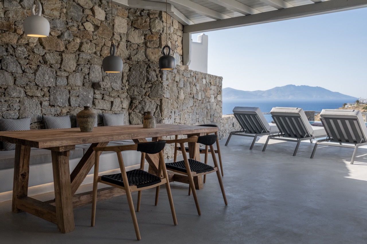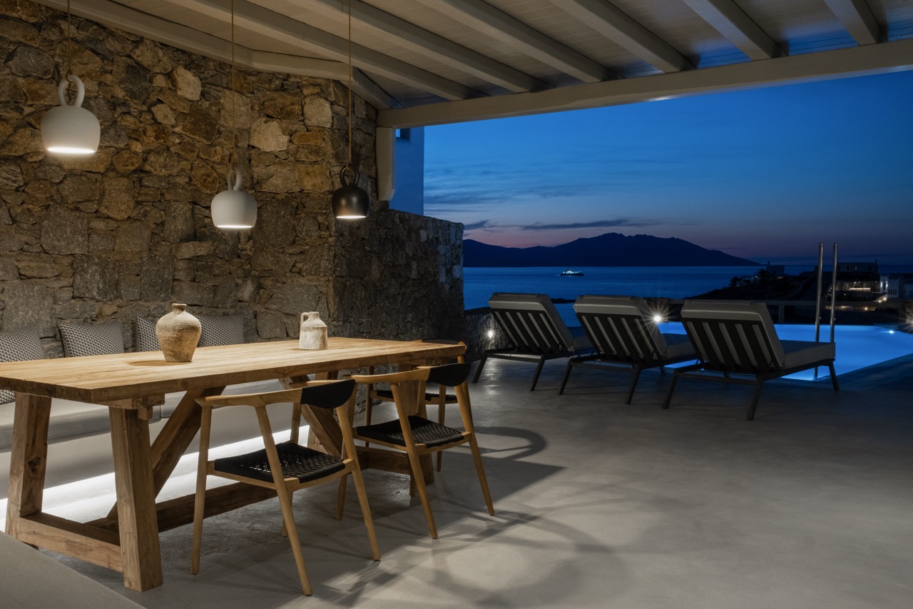 Step outside to experience true Mykonian outdoor living. The villa’s private swimming pool overlooks the endless blue horizon, inviting you to relax beneath golden skies. Comfortable sun loungers, a pergola-shaded dining area, and stylish outdoor lounge furniture create the perfect setting for leisurely breakfasts, sunset cocktails, and unforgettable evenings under the stars.