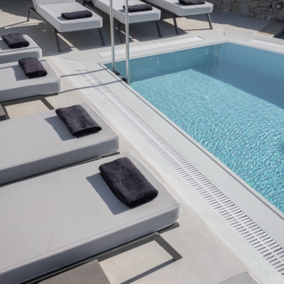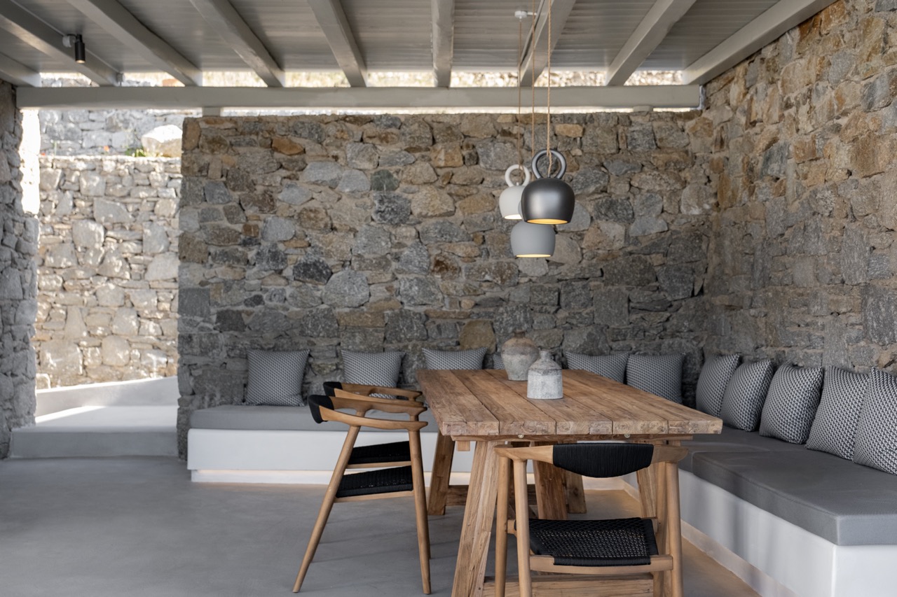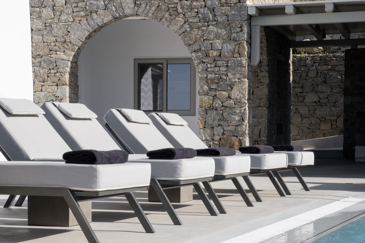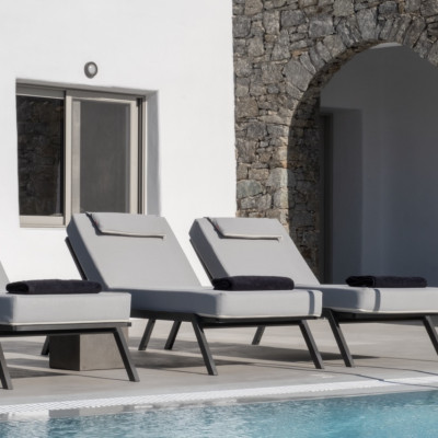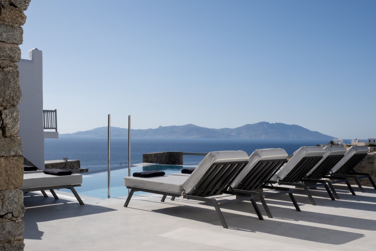 Step outside to experience true Mykonian outdoor living. The villa’s private swimming pool overlooks the endless blue horizon, inviting you to relax beneath golden skies. Comfortable sun loungers, a pergola-shaded dining area, and stylish outdoor lounge furniture create the perfect setting for leisurely breakfasts, sunset cocktails, and unforgettable evenings under the stars.
