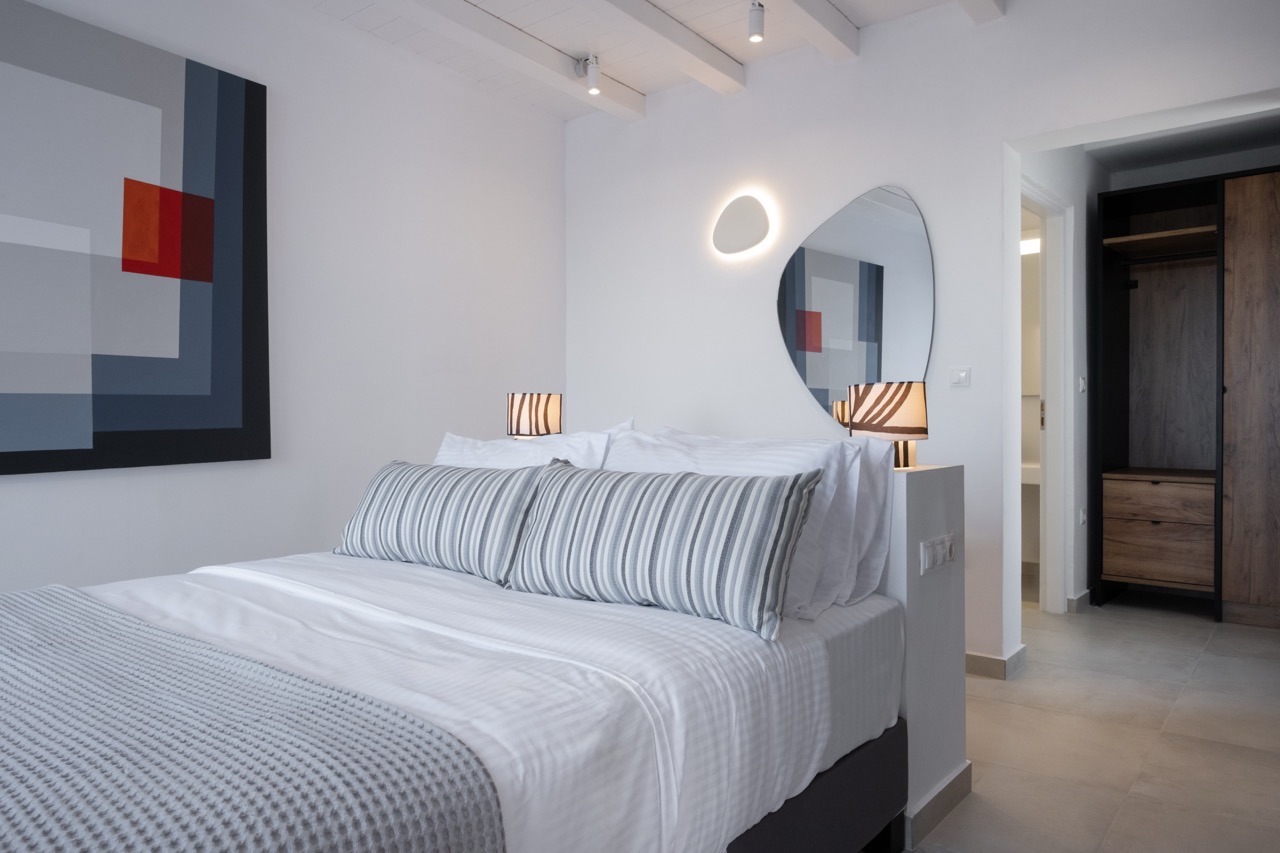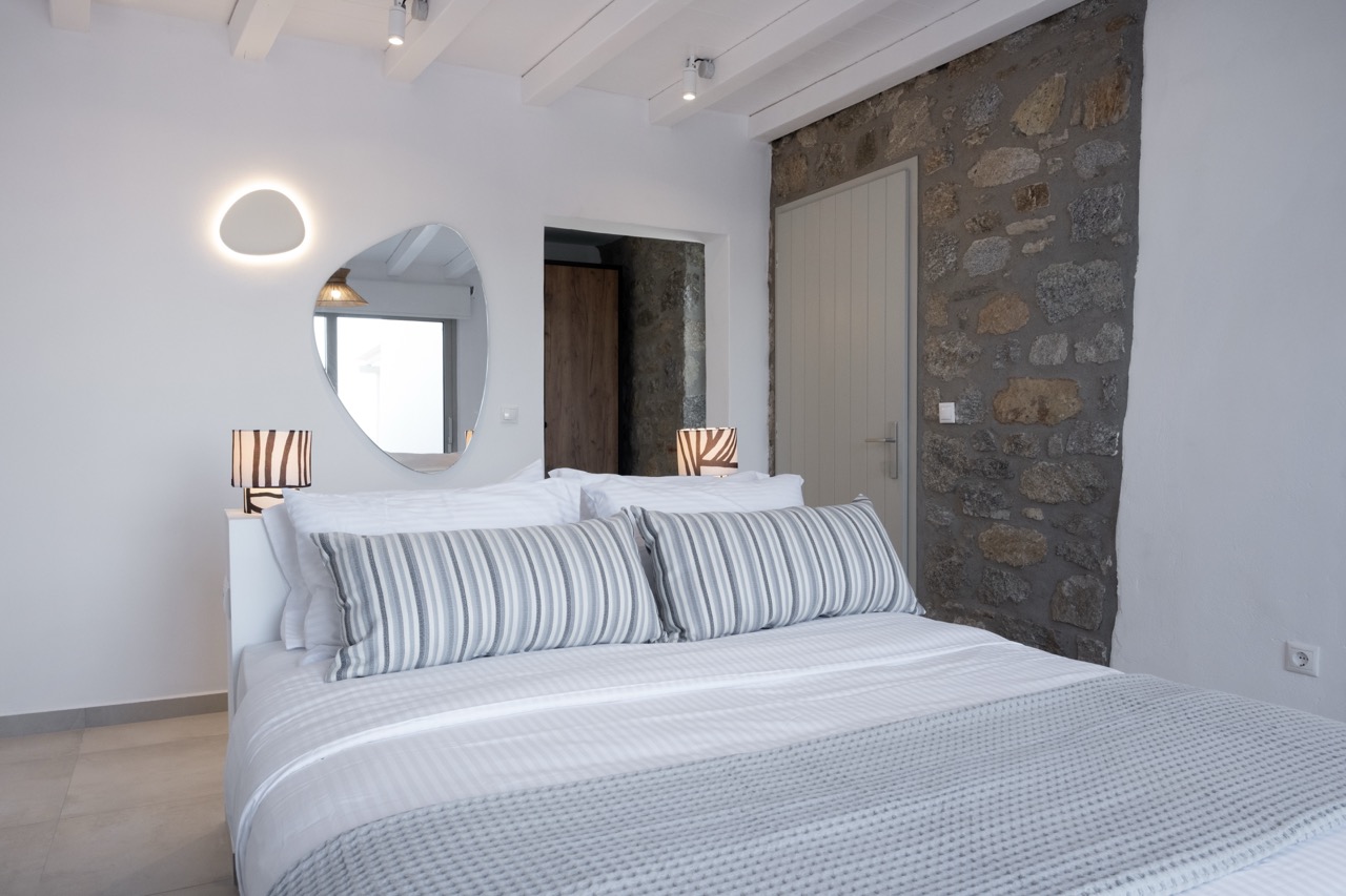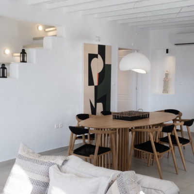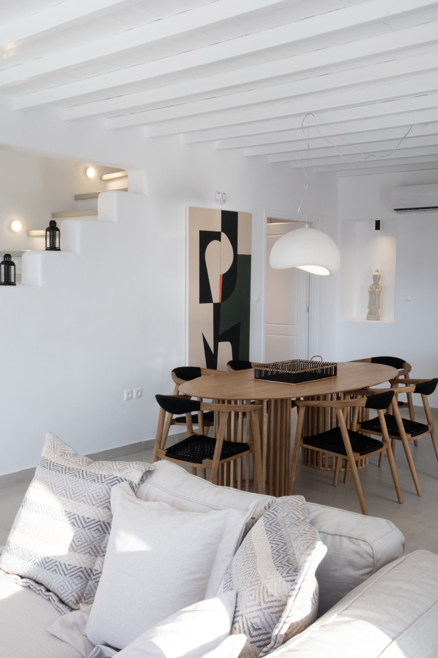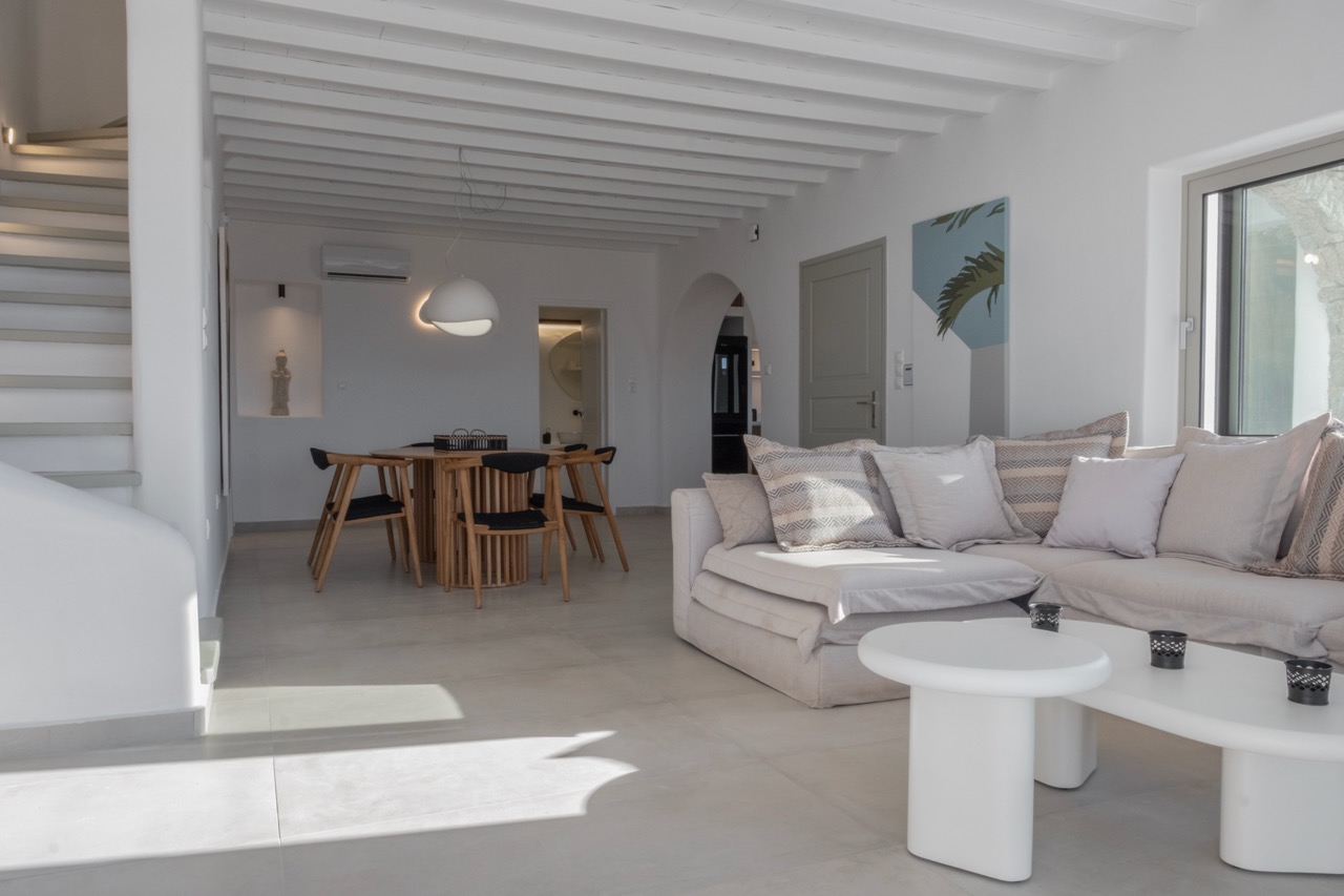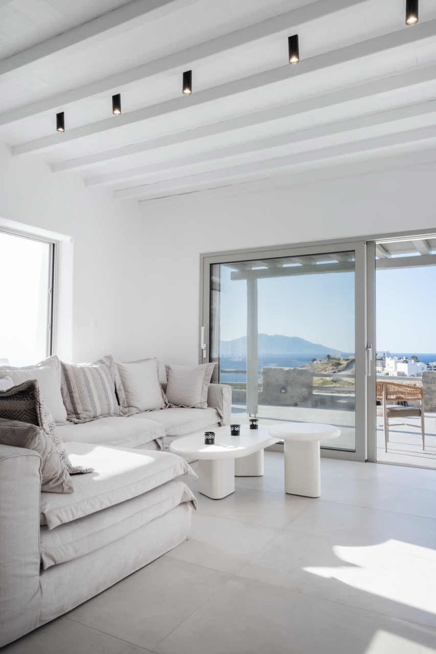 Designed to accommodate up to 8 guests, Villa Mahal features four beautifully appointed bedrooms, including an independent suite with direct access to the pool area — ideal for guests seeking additional privacy. The interiors are bright and airy, blending classic Cycladic architecture with modern elegance. Expansive windows flood the living spaces with natural light while framing breathtaking sea views from every angle.