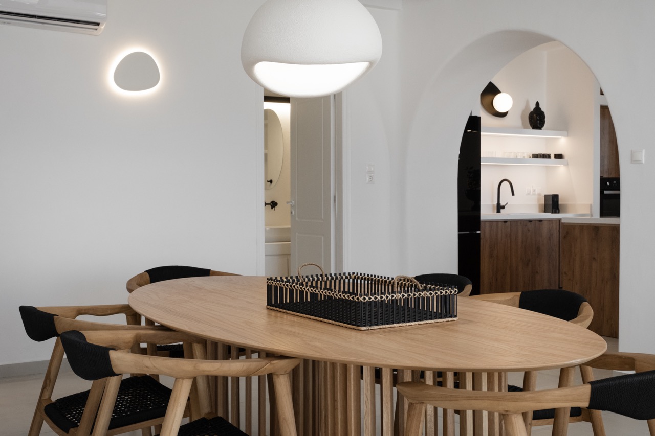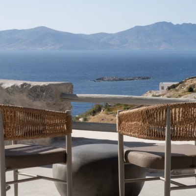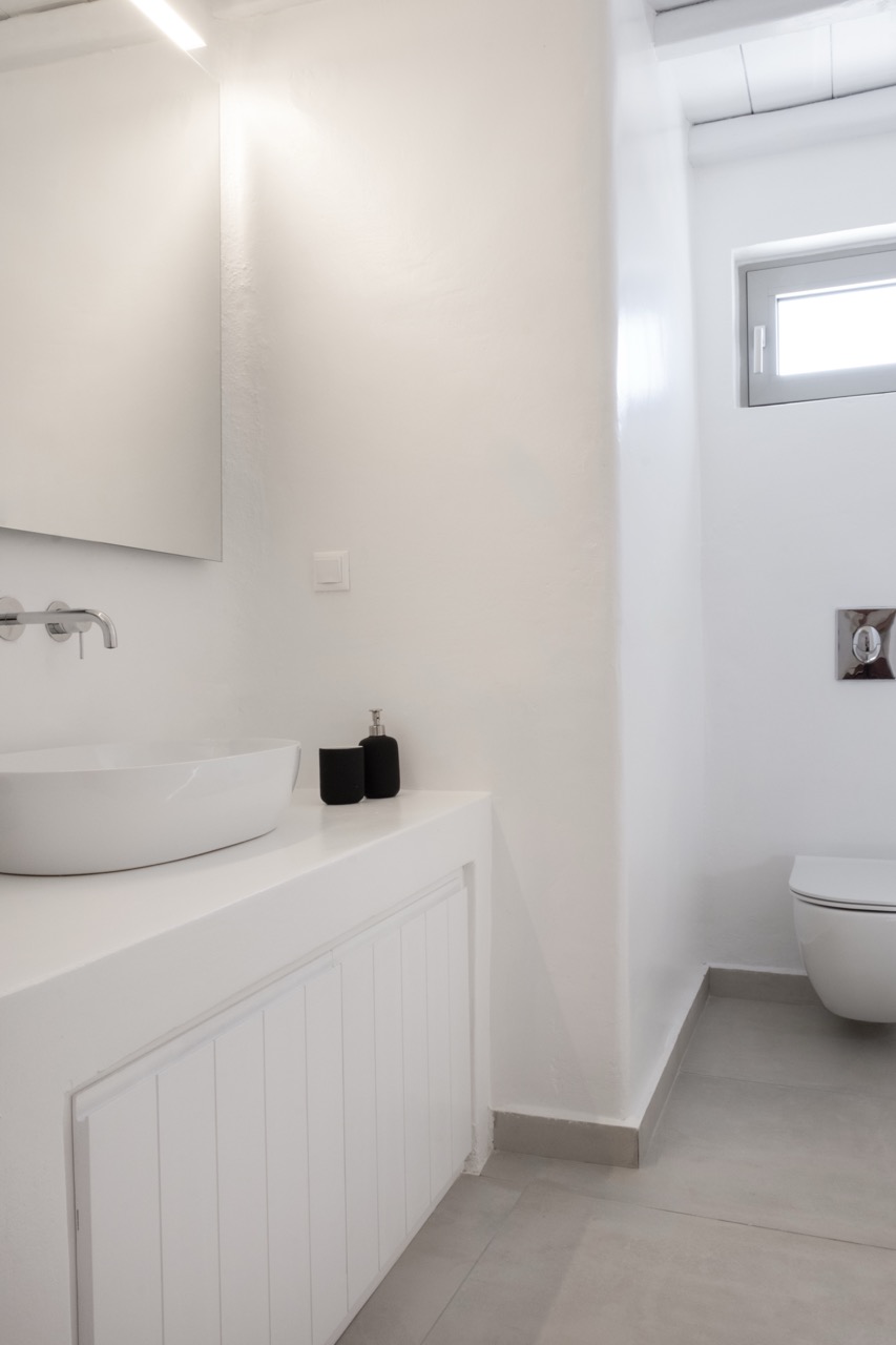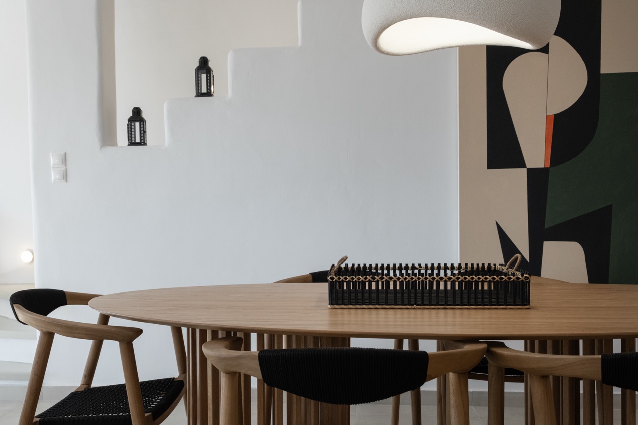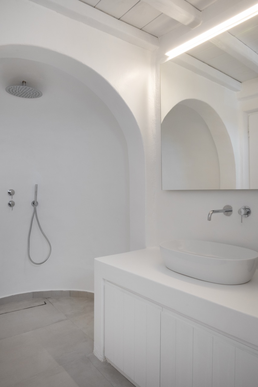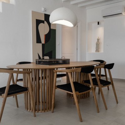 Designed to accommodate up to 8 guests, Villa Mahal features four beautifully appointed bedrooms, including an independent suite with direct access to the pool area — ideal for guests seeking additional privacy. The interiors are bright and airy, blending classic Cycladic architecture with modern elegance. Expansive windows flood the living spaces with natural light while framing breathtaking sea views from every angle.
