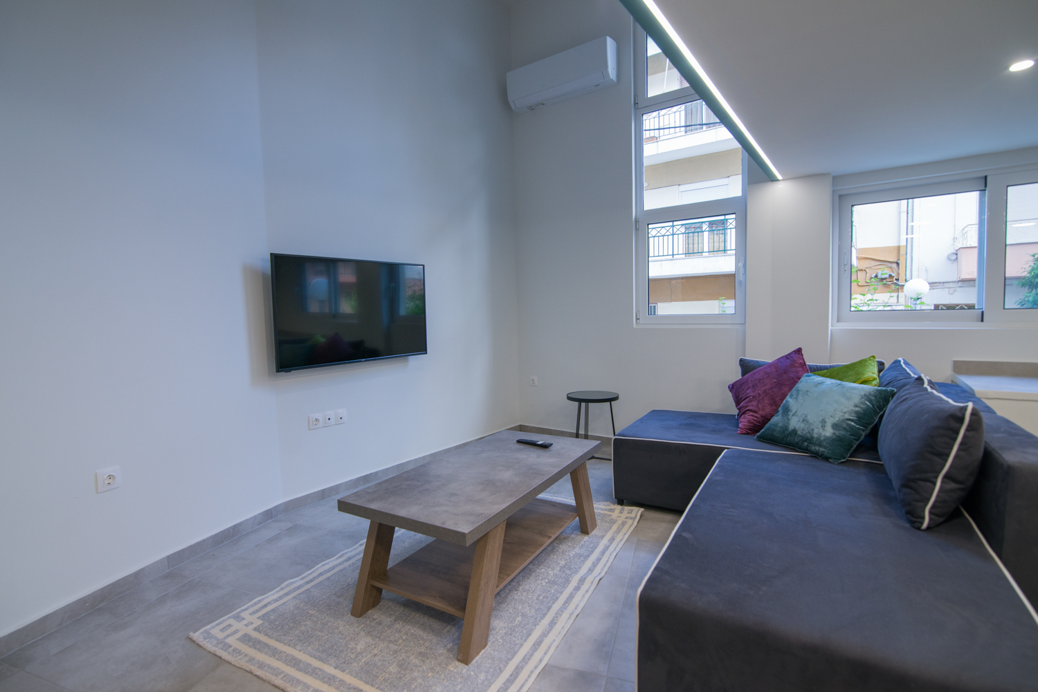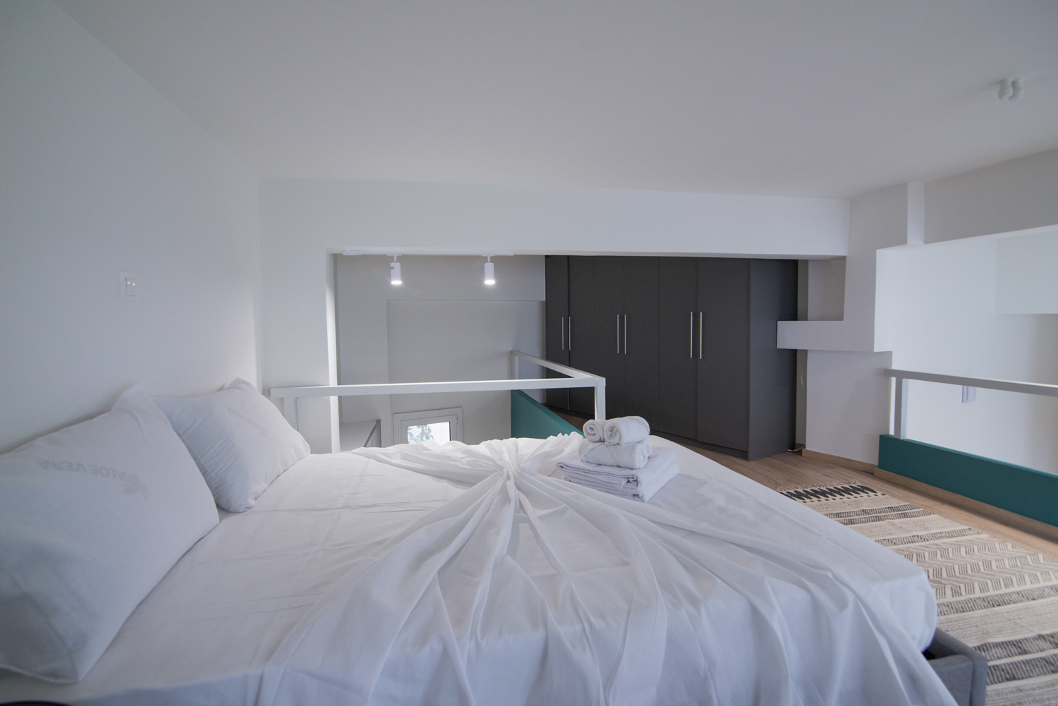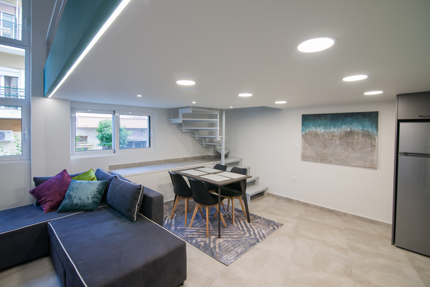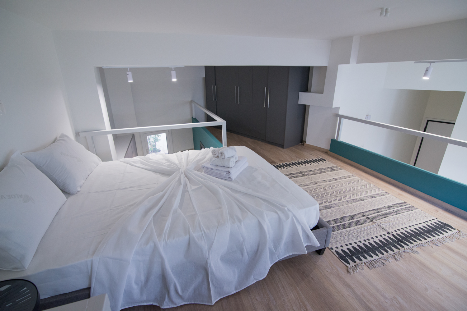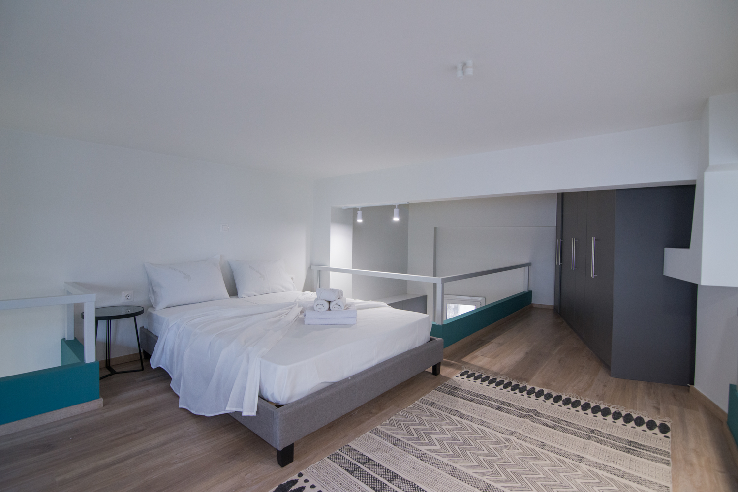 Oculus Dafni Loft by Live&Travel, is a spacious and sunlit space with an adorable living room compiled by chic furniture & a smart flat screen TV for a perfect stay and unique comfort. It has an open floor space with kitchen that is fully equipped along with modern appliances, a dining table that seats four which is inviting for cozy dinners. The maximization of the space is highlighted by the upper floor area that features the bedroom with large closets ensuring tranquility and a quiet comfy sleep.